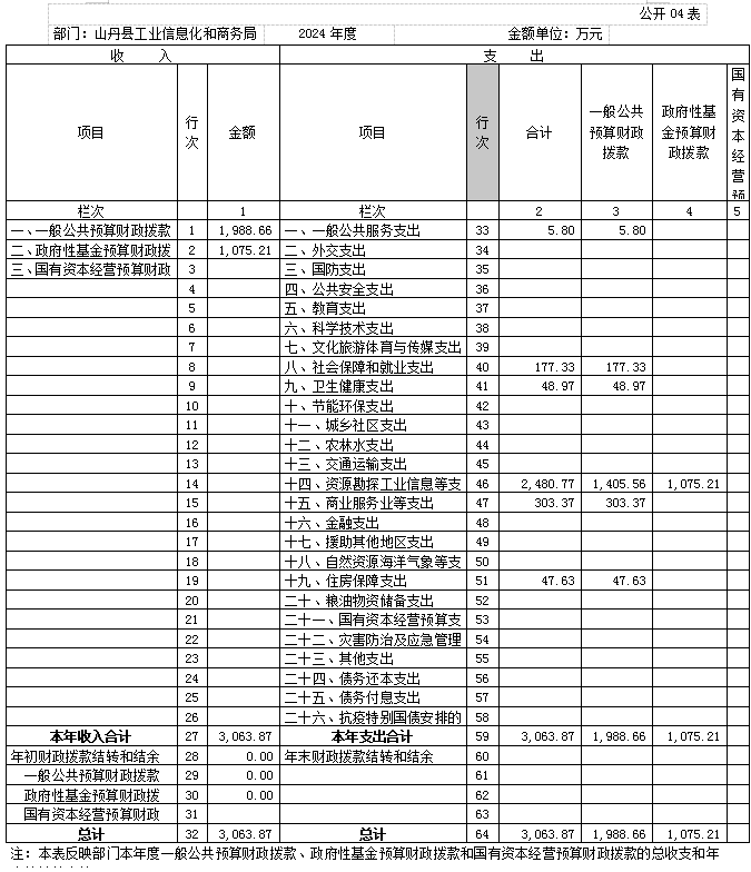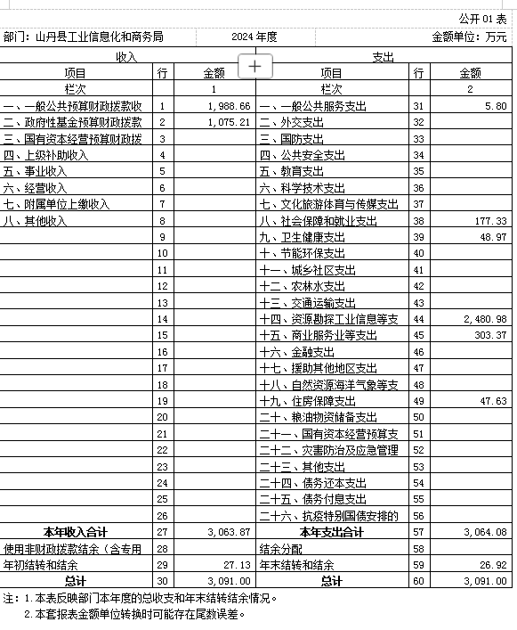 2024年度收、支总计均为3091.00万元。与上年度相比,收、支总计各增加1606.34万元,增长108.20%,主要原因是我单位2024年5月因机构改革,单位合并,原商务局所有资金全部划入山丹县工业信息化和商务局,故收支增加。