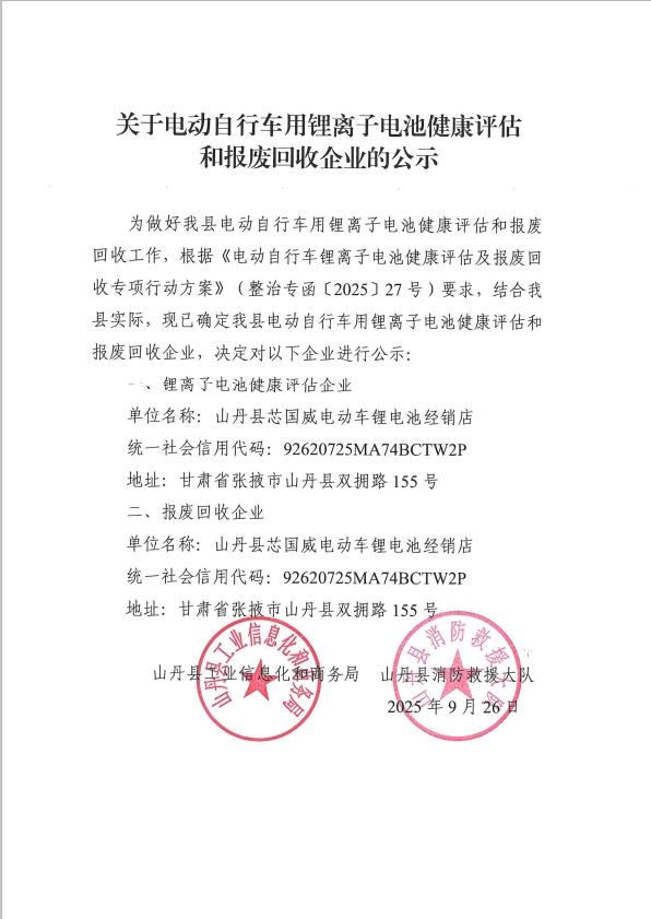 关于电动自行车用锂离子电池健康评估和报废回收企业的公示