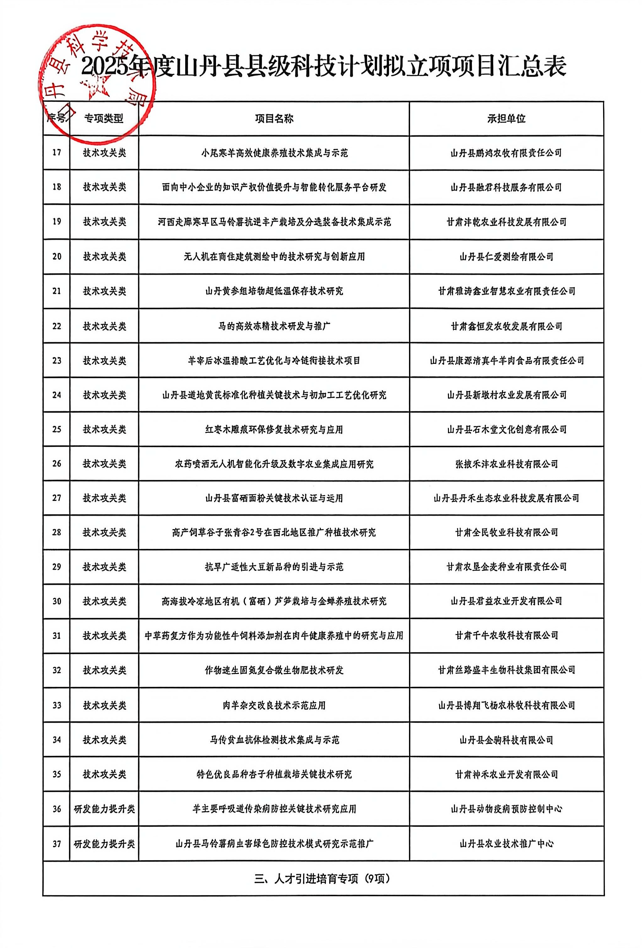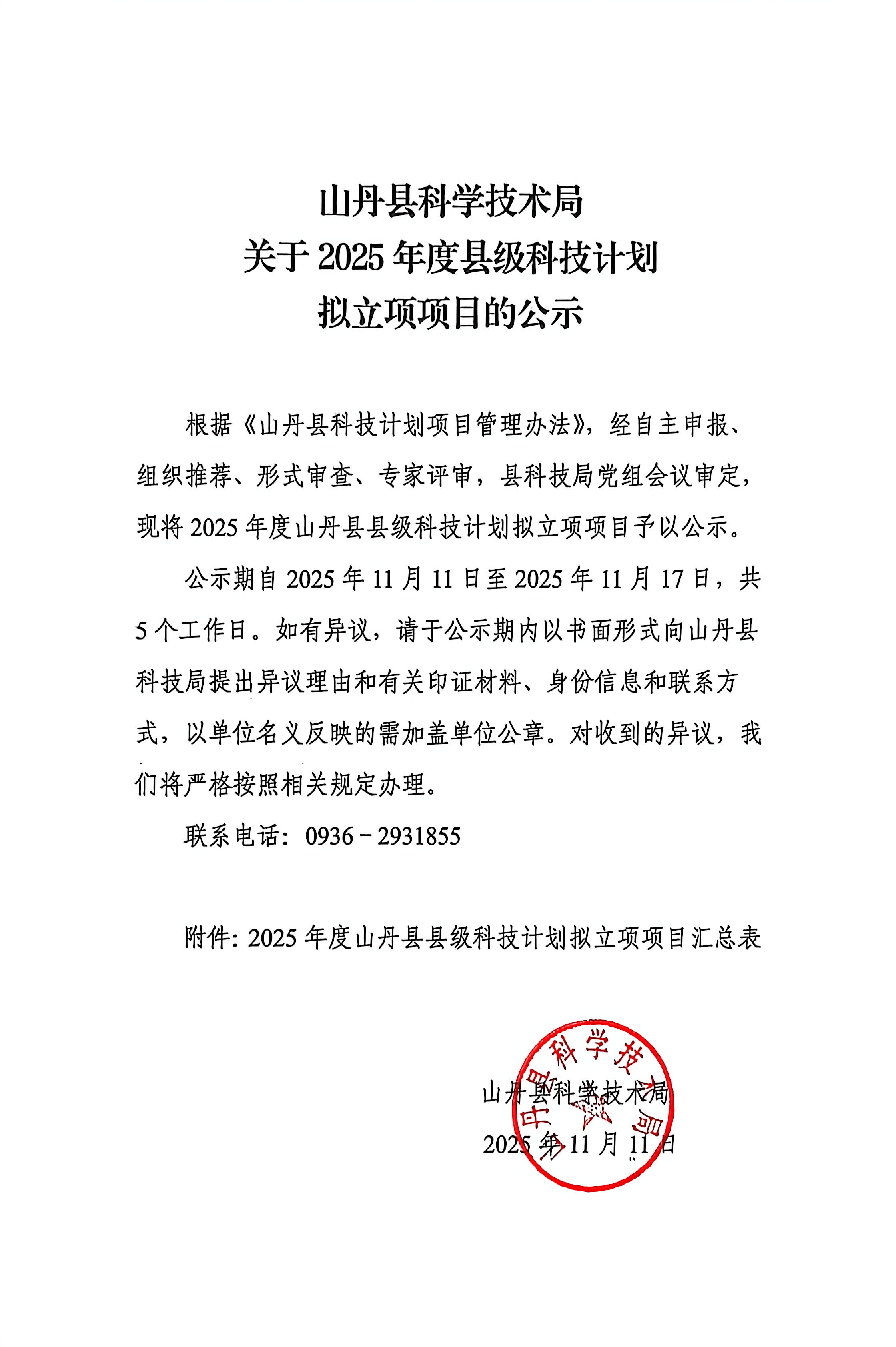 山丹县科学技术局 关于2025年度县级科技计划 拟立项项目的公示