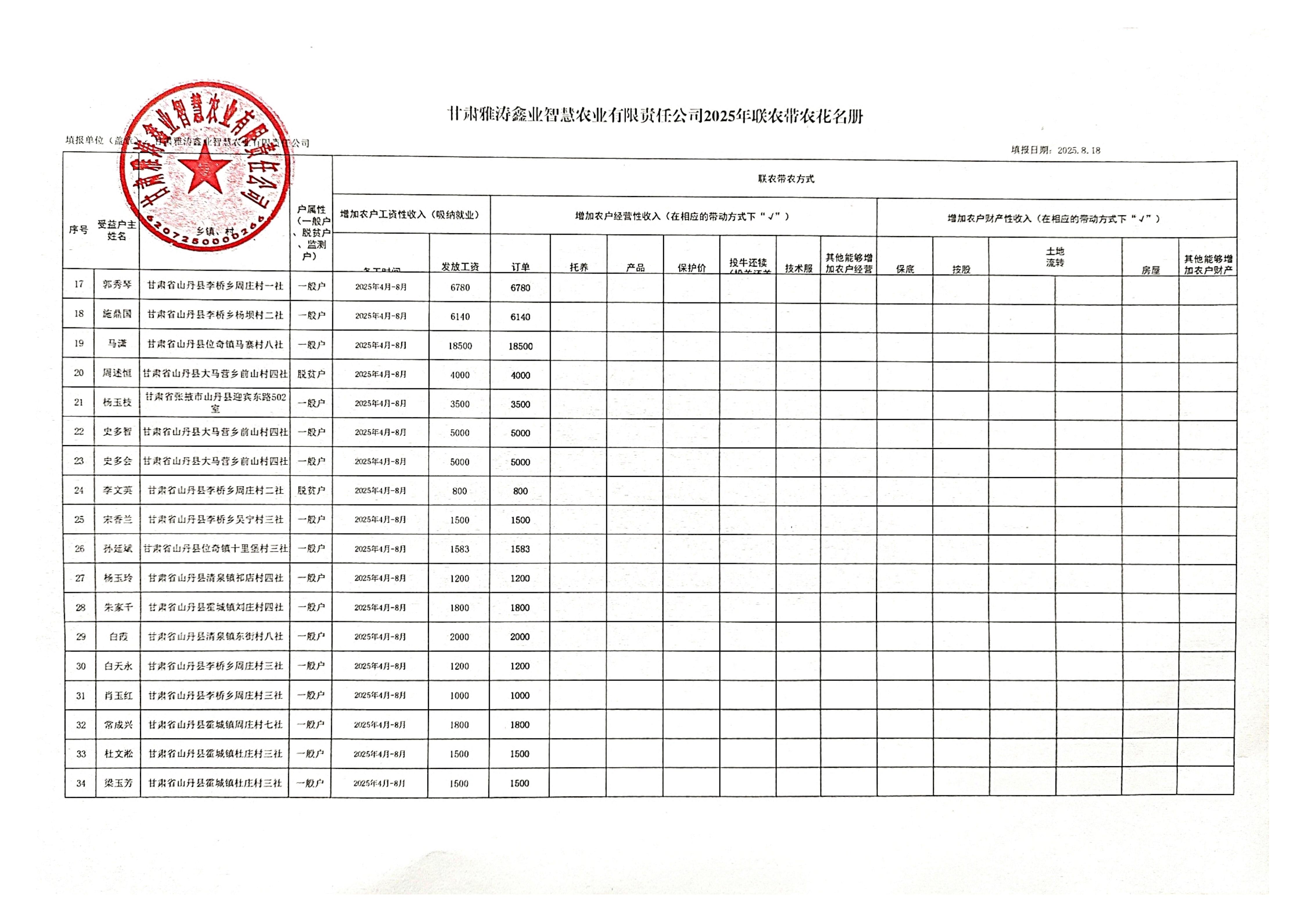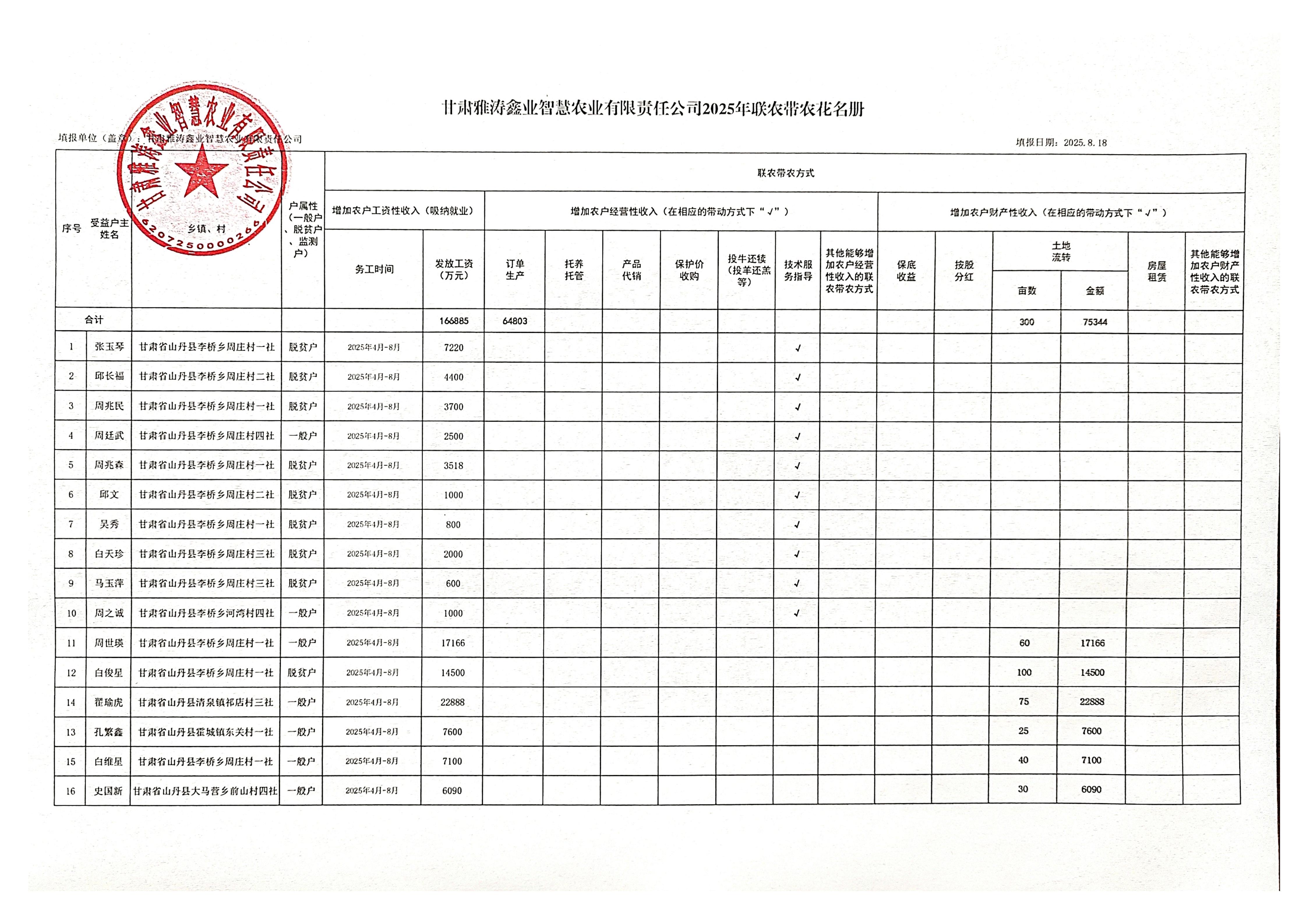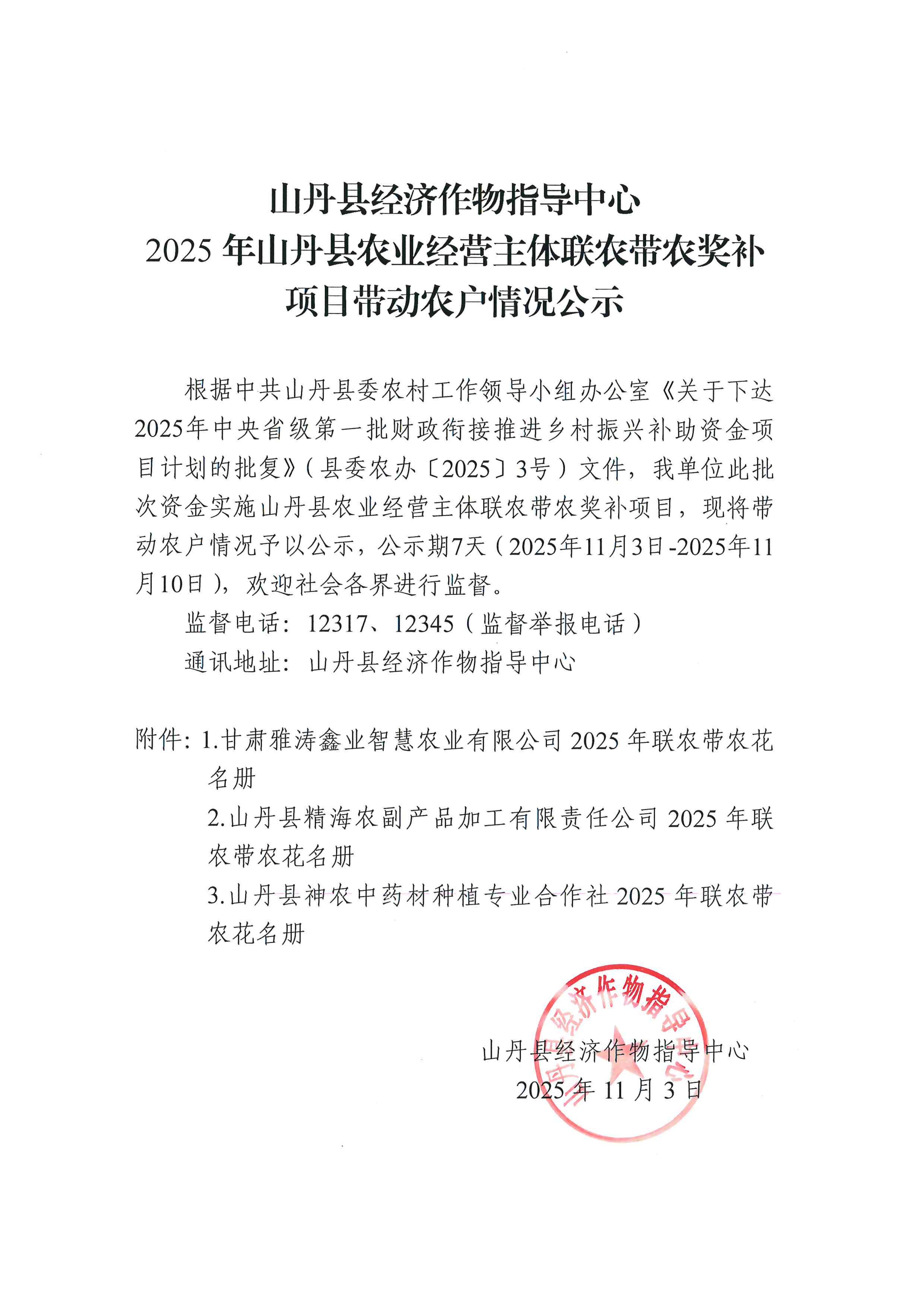 山丹县农业经营主体联农带农奖补项目带动农户情况公示