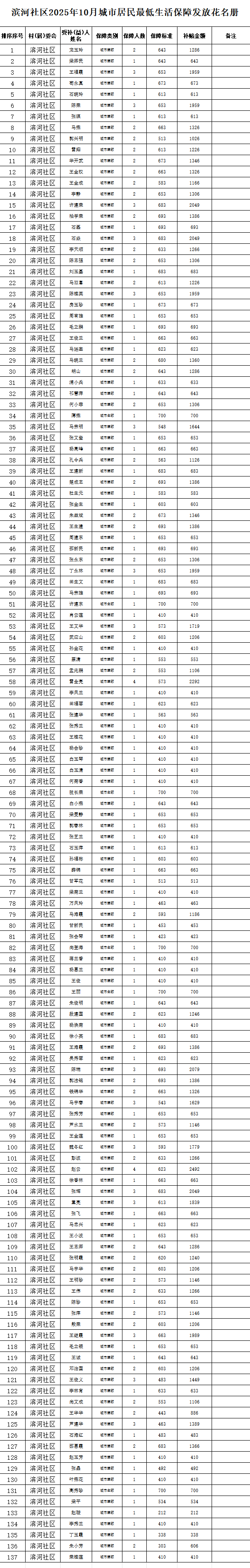 滨河社区2025年10月城市居民最低生活保障发放花名册