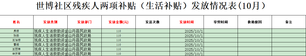 世博社区2025年10月残疾人两项补贴发放花名册(生活补贴)