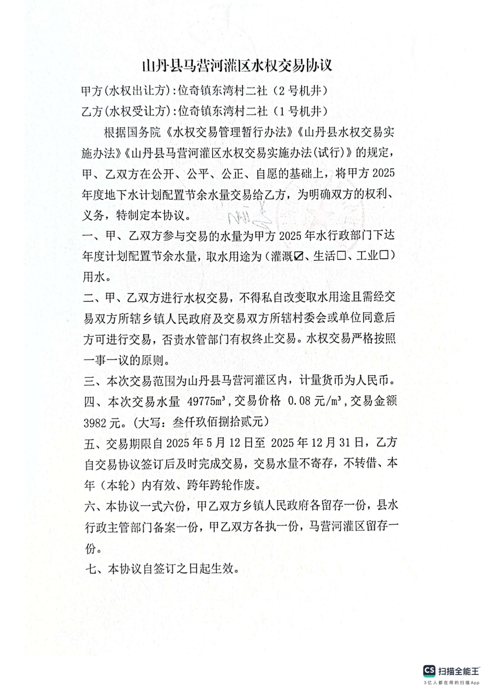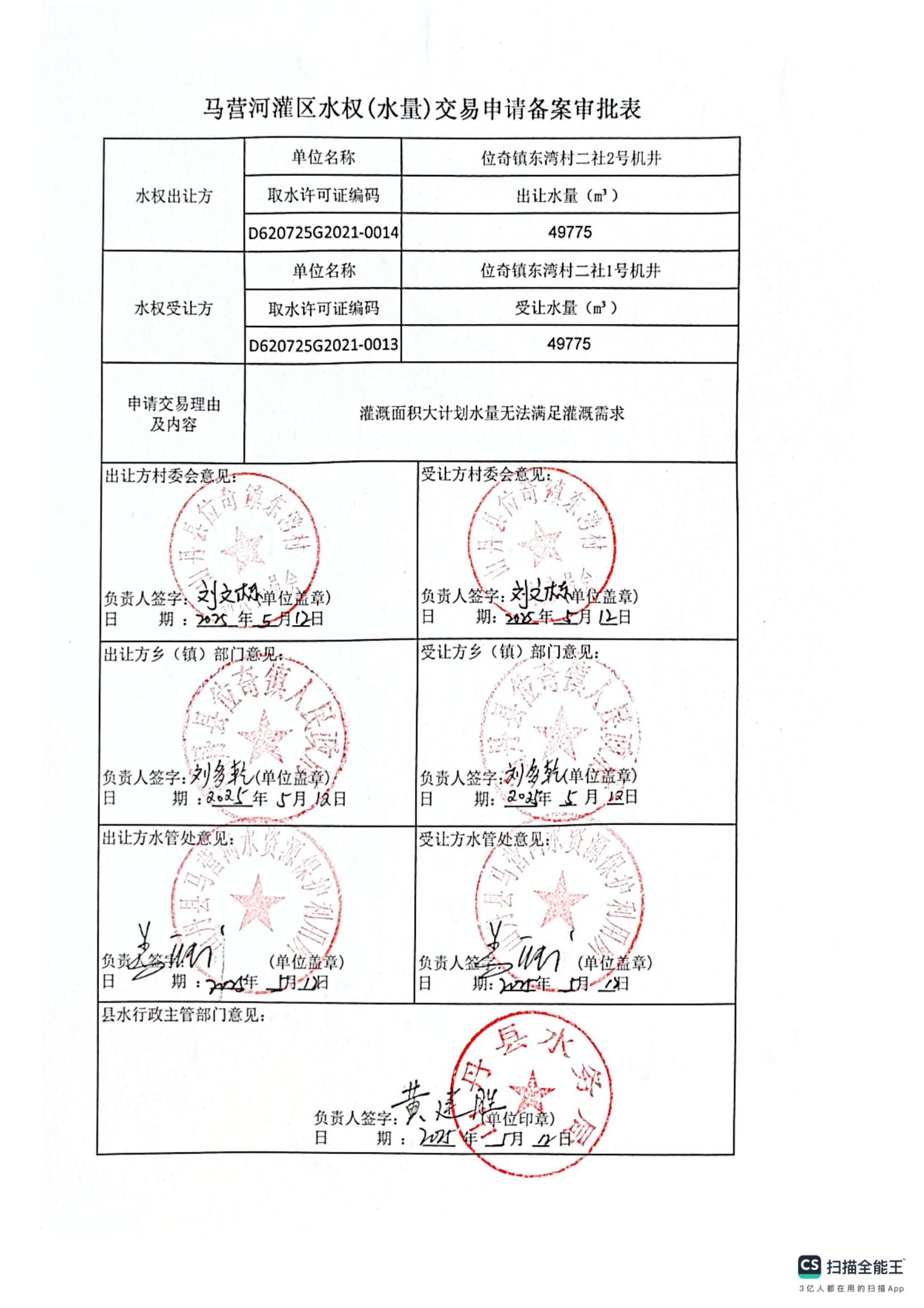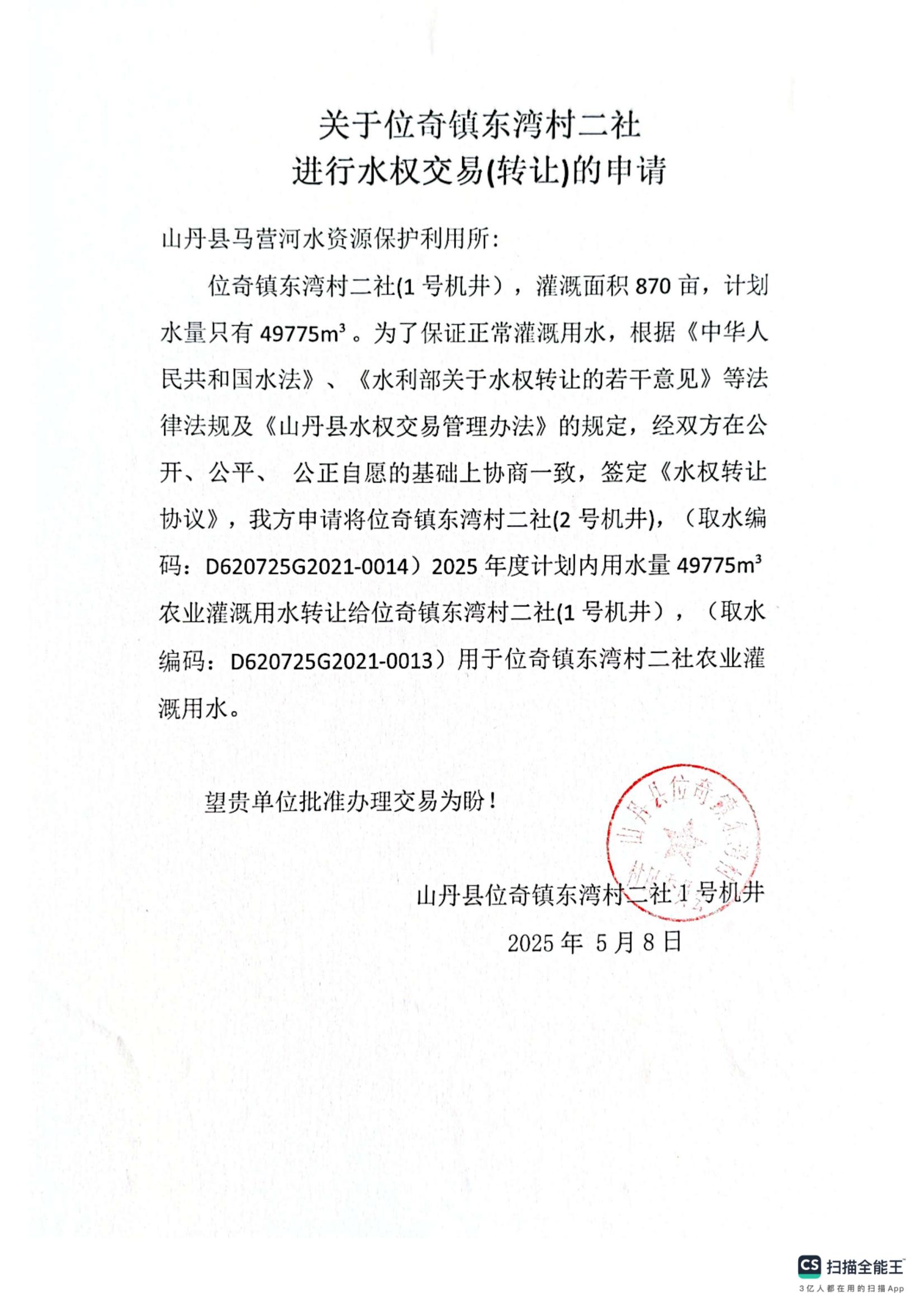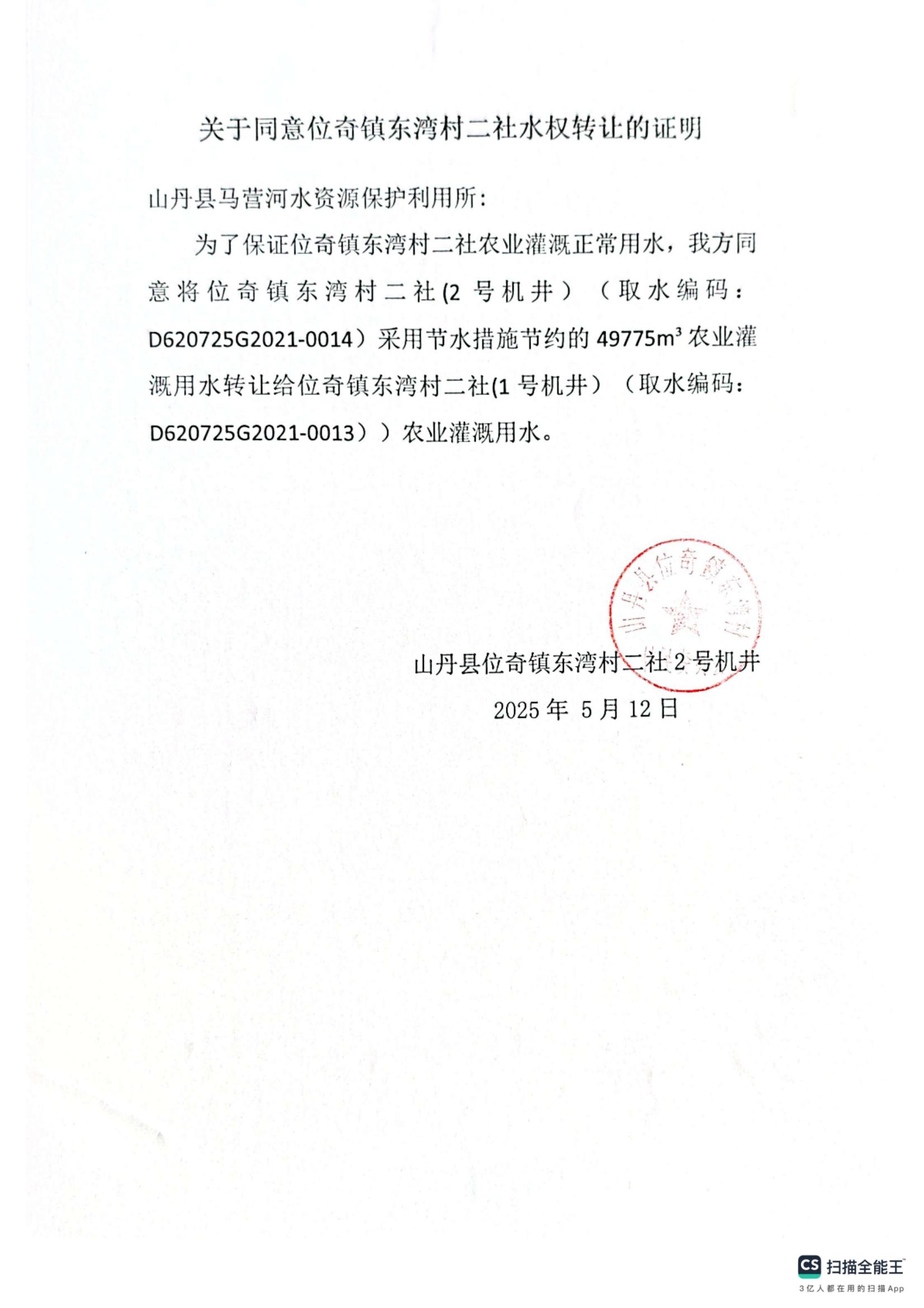 关于同意位奇镇东湾村二社2号机井水权转让同意的申请证明