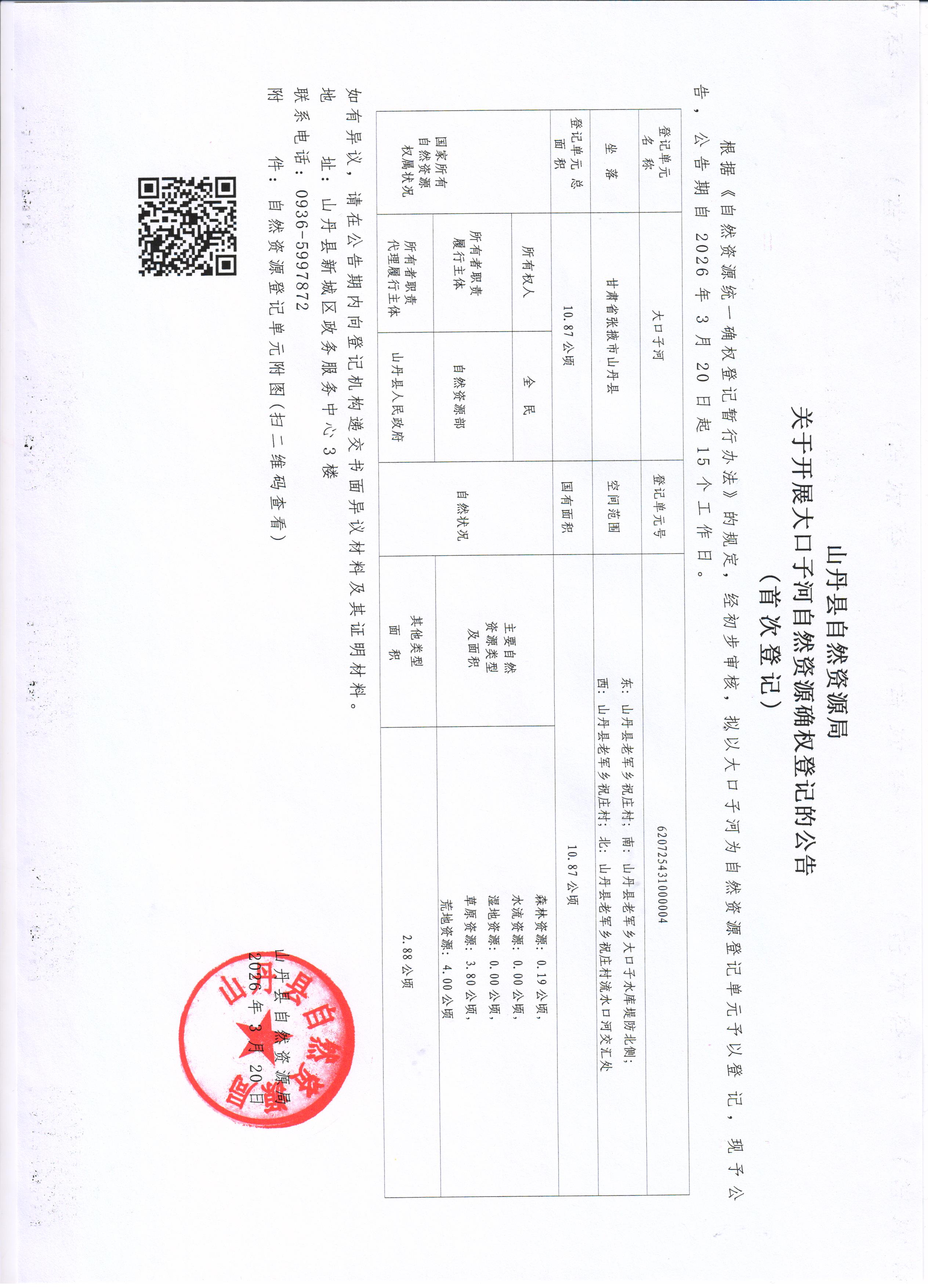 根据《自然资源统一确权登记暂行办法》的规定,经初步审核,拟以大口子河为自然资源登记单元予以登记,现予公告,公告期自2026年3月20日起15个工作日。