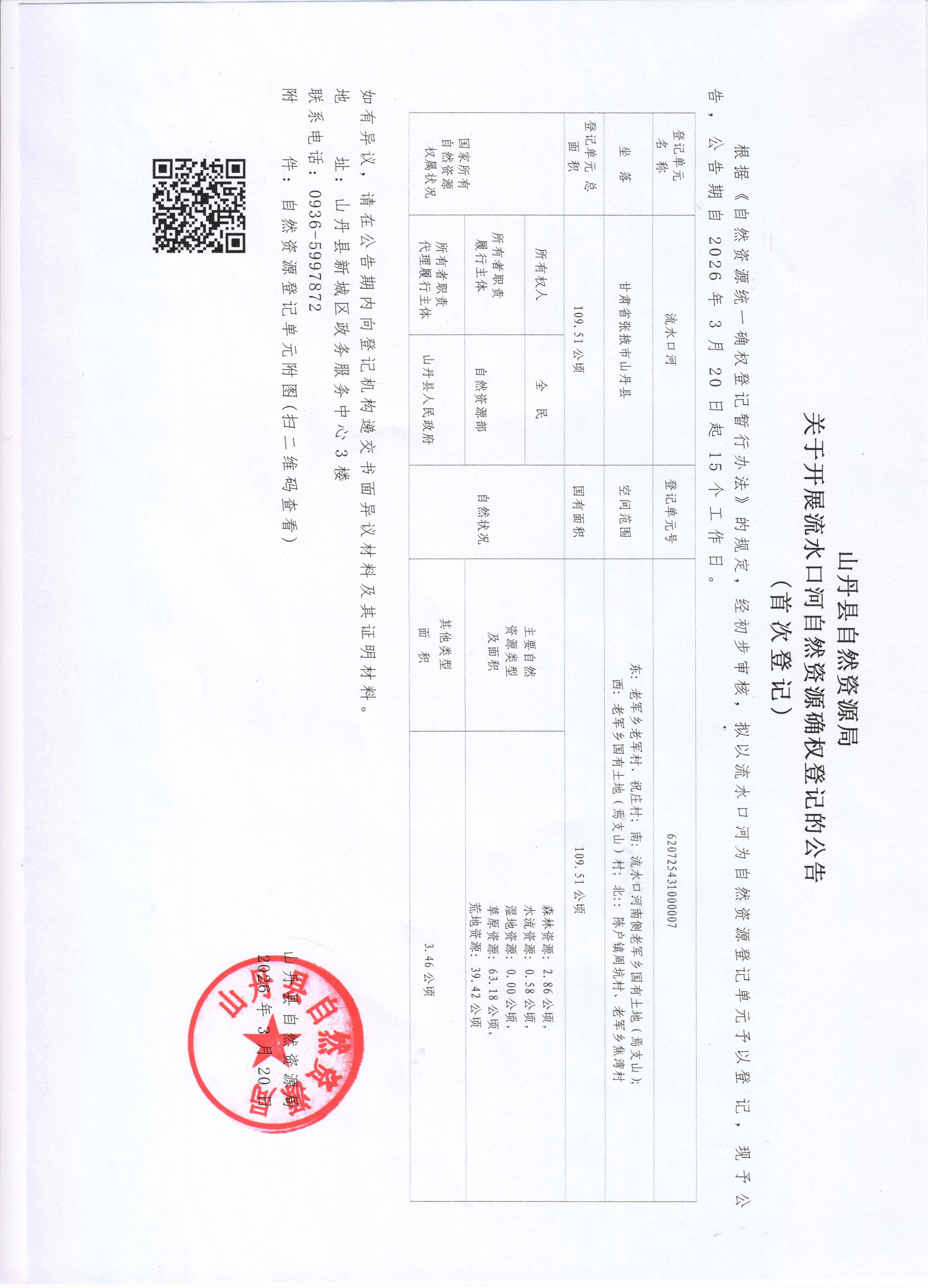 根据《自然资源统一确权登记暂行办法》的规定,经初步审核,拟以流水口河为自然资源登记单元予以登记,现予公告,公告期自2026年3月20日起15个工作日。