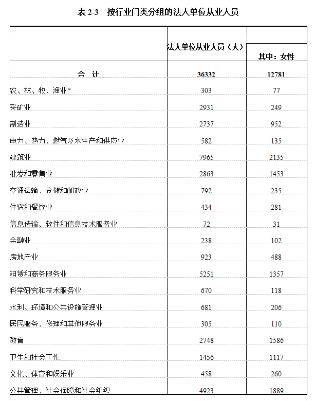 在第二产业和第三产业法人单位从业人员中,位居前三位的行业是:建筑业7965人,占22.05%;租赁和商务服务业5251人,占14.54%;公共管理、社会保障和社会组织4932人,占13.65%(详见表2-3)。