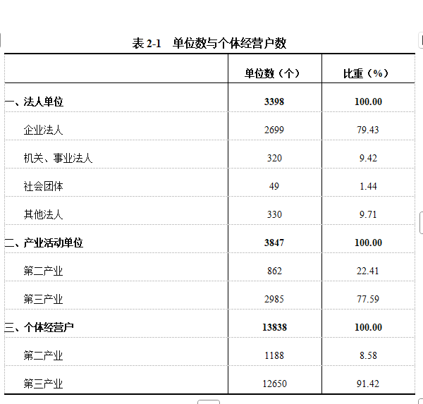 2023年末,全县共有从事第二产业和第三产业活动的法人单位3398个,比2018年末增加445个,增长15.07%;产业活动单位个,增加481个,增长14.29%;个体经营户13838个,增加2411个,增长21.10%(详见表2-1)。
