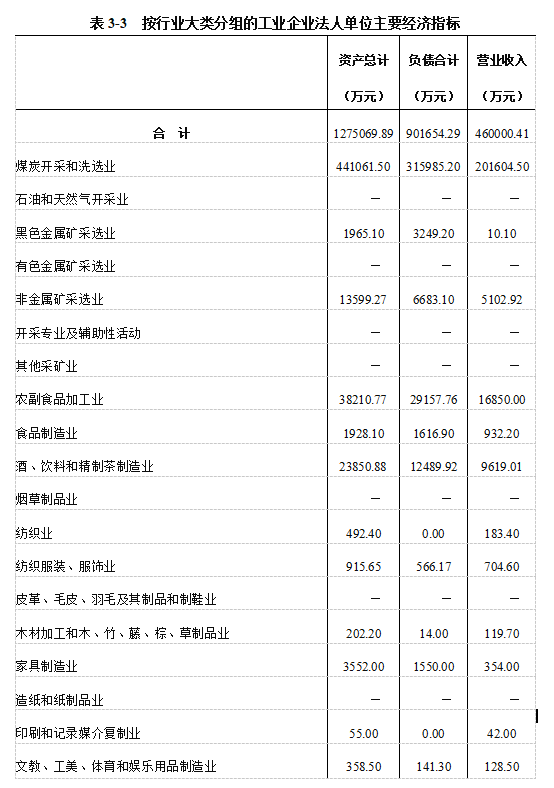 在工业企业法人单位从业人员中,采矿业2931人,制造业2737人,电力、热力、燃气及水生产和供应业582人,分别占18.64%、71.26%和10.10%。在工业行业大类中,煤炭开采和洗选业,非金属矿物制品业,电力、热力生产和供应业从业人员数位居前三位,分别占43.74%、18.24%和5.49%(详见表3-2)。