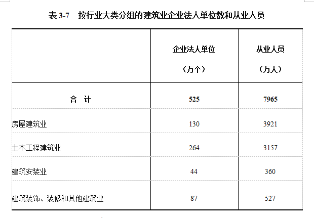 建筑业企业法人单位从业人员中,房屋建筑业占49.23%,土木工程建筑业占39.64%,建筑安装业占4.52%,建筑装饰、装修和其他建筑业占6.61%(详见表3-7)。