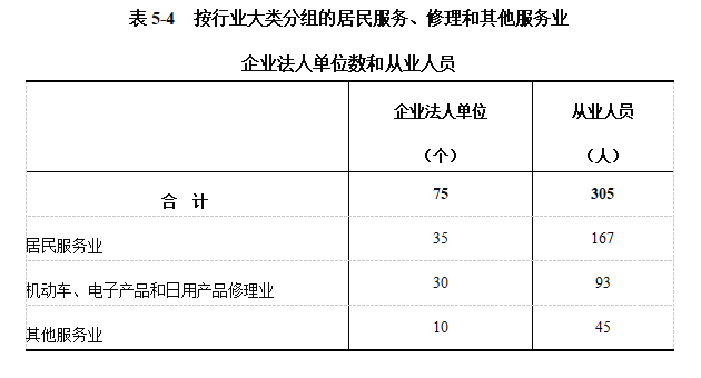 2023年末,全县共有居民服务、修理和其他服务业企业法人单位75个,从业人员305人,分别比2018年末增长22.95%和28.15%(详见表5-4)。