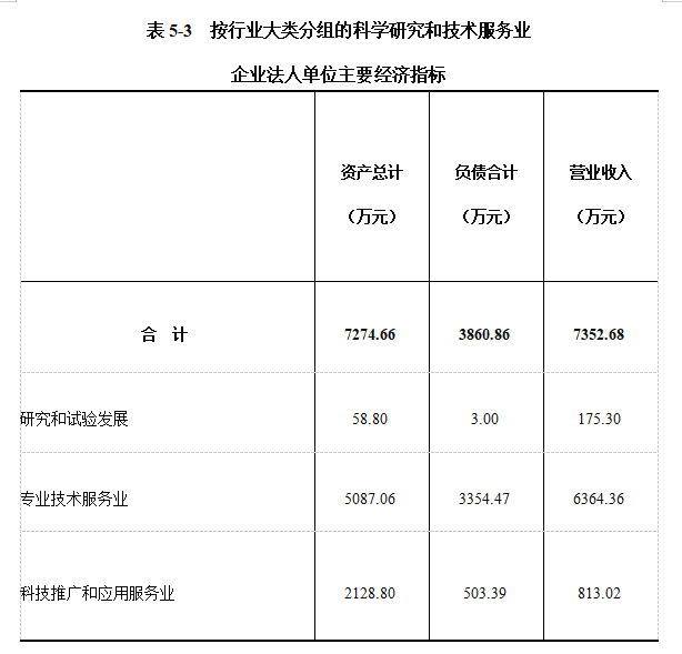 2023年末,科学研究和技术服务业企业法人单位资产总计7274.66万元,比2018年末下降82.63%;负债合计3860.86万元,比2018年末下降67.14%。