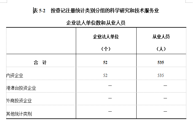 在科学研究和技术服务业企业法人单位从业人员中,内资企业占100%(详见表5-2)。