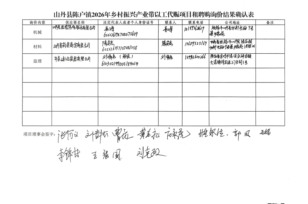 询价与比价会议:2026年4月7日召开项目理事会专题会议,确定租购聘建议对象;4月8日上午10:30在山丹县陈户镇范营村委活动室召开询价比价工作会议,由项目理事会成员以询价评比方式民主确定最终租购聘对象,县级行业部门以工代赈项目负责人、陈户镇监督工作领导小组相关人员列席监督,过程合法合规。