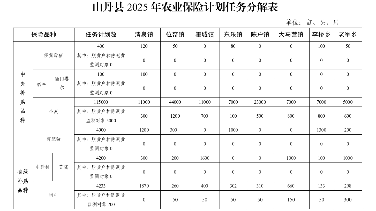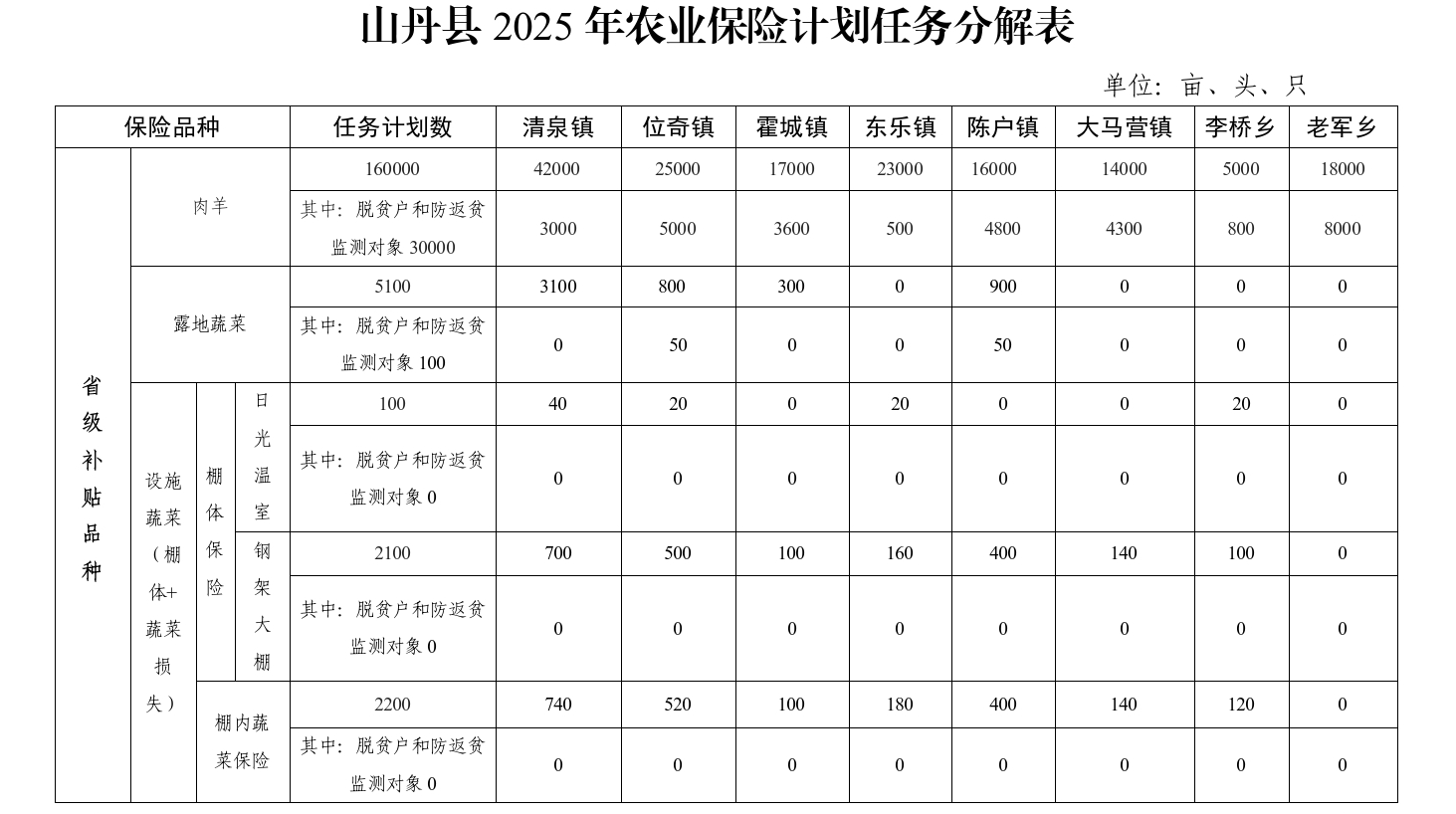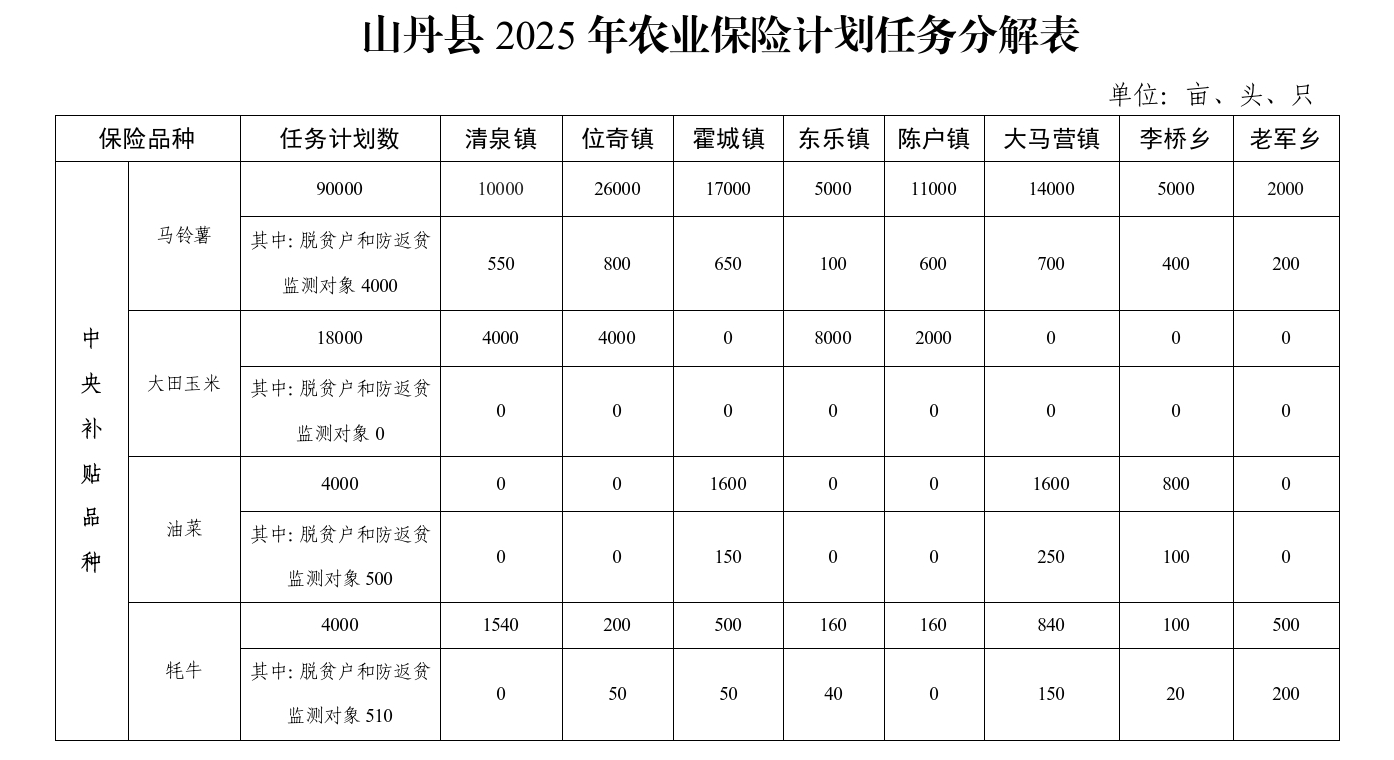 2025年全县政策性农业保险工作由县农业农村局、县财政局、各乡镇人民政府共同组织实施,中国人民财产保险有限公司山丹支公司、中国大地财产股份有限公司、中国平安财产保险股份有限公司山丹支公司具体承办。