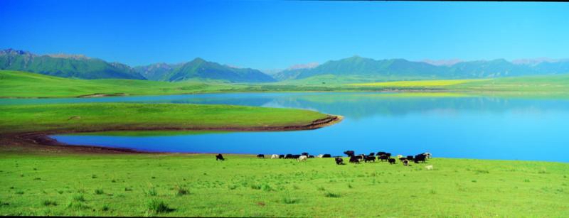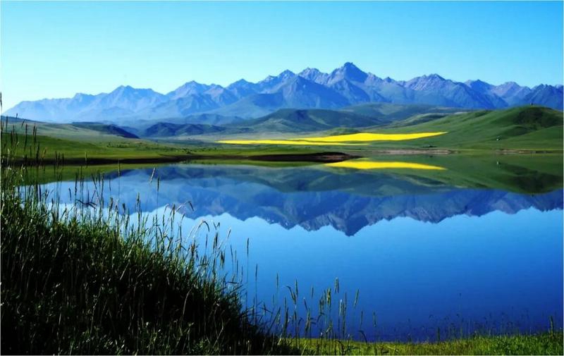 唐代诗人张祜有《司马相如琴歌》一首,曰:“凤兮凤兮非无凰,山重水阔不可量。梧桐结阴在朝阳,濯羽弱水鸣高翔。”这首诗里表达的是一段凤求凰的爱情故事。诗中之凤凰濯羽弱水的故事情节进一步印证了“鸾鸟湖”和凤凰“濯羽弱水”的故事影响之大,非一般民间传说故事所能及。站在鸾鸟湖北岸的山坡上向南远眺,只见蔚蓝色的天空飘浮着一朵朵白云,黛青色的冷龙岭山顶上皑皑白雪直插云天。山下,蓝天、白云、雪山、牛羊和马群的倒影与湖水相互映衬,站在湖边,宛如置身一幅蓝色调的山水画卷之中。
