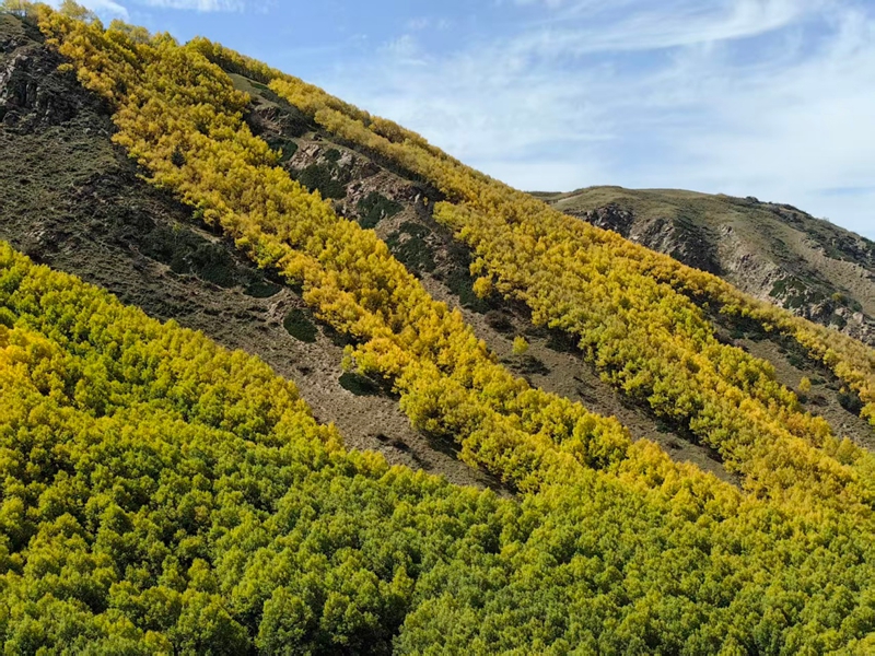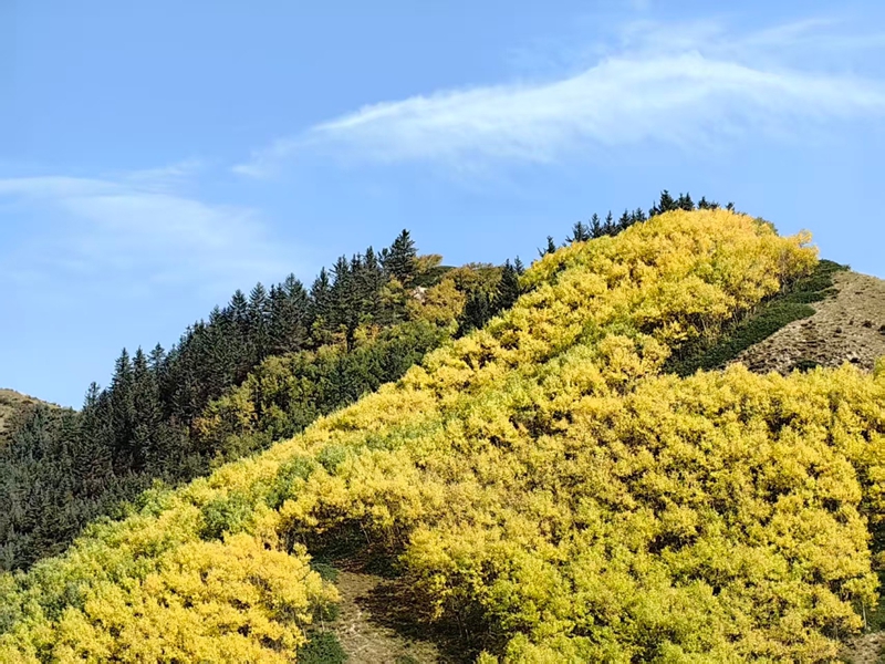 秋天,焉支山林间树木披上金黄,宛若身披“黄金甲”,在阳光下熠熠生辉。