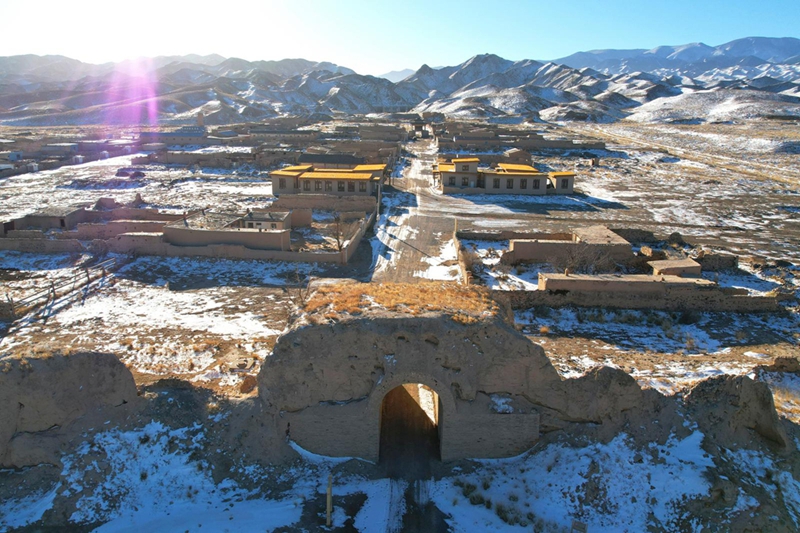 远处祁连雪峰连绵如练,近处坡地雪痕与枯茎交织,新旧屋舍错落于苍茫之间。