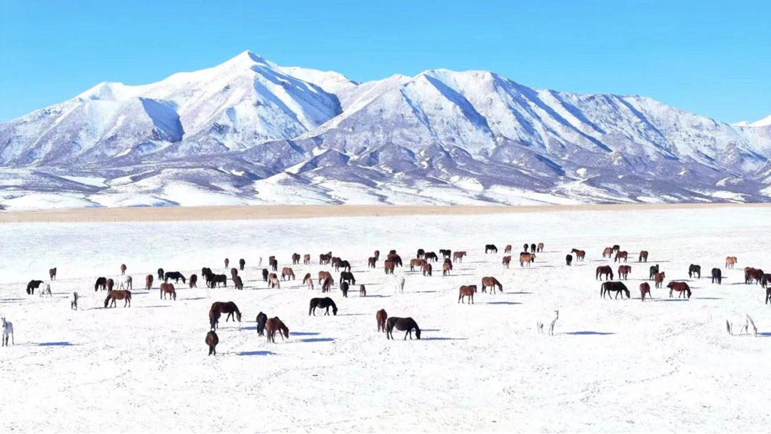 山丹军马场的雪,是无垠的绒毯,铺陈在祁连山冷龙岭的雪峰之下,苍茫接天。羊群在雪地或悠闲觅食,矫健身姿在白雪映衬下更显英姿飒爽。马蹄扬起的雪花如白雾弥漫,未完全封冻的湖泊如镶嵌在雪地里的蓝宝石,泛着清冷光泽,倒映着雪山与飞鸟的剪影。牧马人的身影渐渐融入雪色,只留下一串深浅不一的蹄印,像是大地写下的诗行。