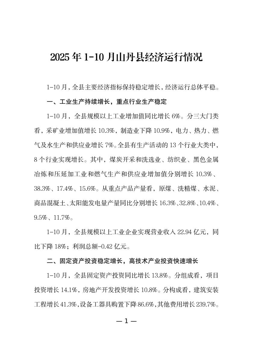 2025年1-10月山丹县统计月报