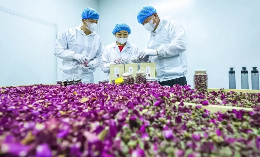 老军乡的千亩玫瑰庄园,是山丹县“一链一品”模式写下的最绚丽篇章。每年花期,1500亩“龙玫一号”玫瑰花海迎风怒放,馥郁芬芳弥漫四野,蔚为壮观。步入庄园的现代化加工厂,自动化生产线高速运转,去杂、色选、消毒、加工等环节一气呵成,工作人员有条不紊地将娇艳的玫瑰花转化为玫瑰花酱、玫瑰茶等精美产品。这条生产线,正是庄园实现种植标准化、加工智能化、研发多元化、经营品牌化的现代玫瑰产业体系的核心支撑。