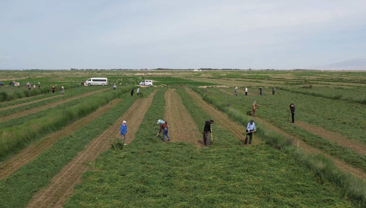 务工人员 刘向伟:收割机一天收割300到400亩苜蓿,每亩地在30元左右,一天能收入10000元左右。