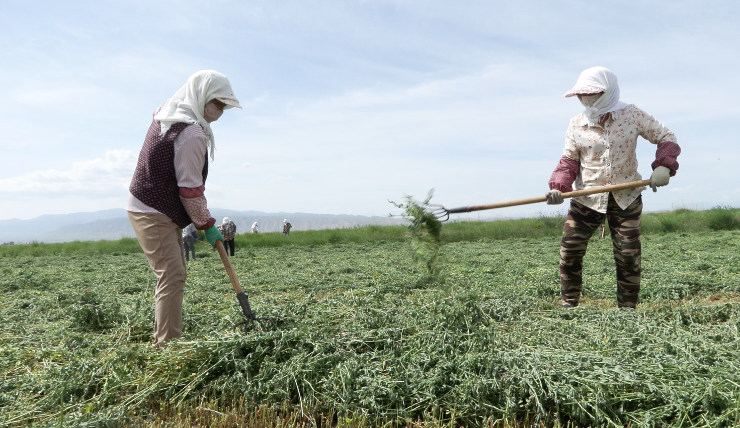 务工人员 周志明:今天过来翻苜蓿,每天能挣到150元,就地务工,不用走外面,在家门口就能有钱挣。