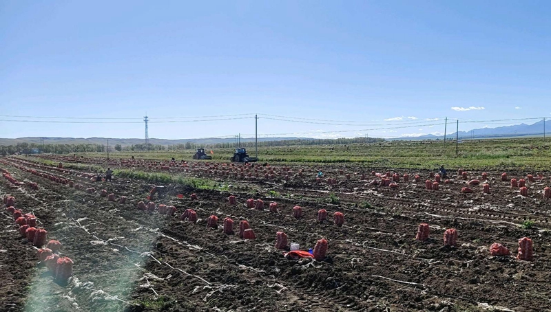 在山丹县正明有限责任公司种薯繁育霍城基地,只见马铃薯收获机与配送车齐头并进、来回穿梭,批量的马铃薯种薯从土壤里翻出来,满载的配送车直接将刚出地的马铃薯种薯运送至仓库,准备发往云南。