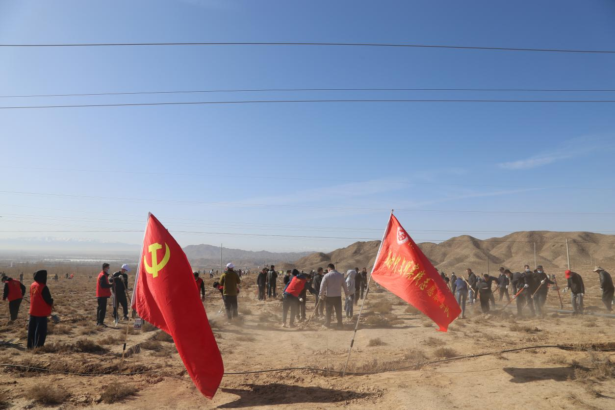 上午9时,党员们身着红马甲,佩戴党员徽章,在党旗的引领下奔赴植树现场。活动现场划分责任区,党员们三人一组、五人一队,挥锹铲土、扶苗填坑、提水浇灌,干劲十足。经过3小时奋战,共栽种沙枣、红柳、白榆等苗木20000余株,200亩荒坡披上“绿装”,焕发勃勃生机。“作为党员,种下的不仅是树苗,更是守护绿水青山的责任。”青年党员吴玉涛擦拭汗水说道。活动现场,县林草局专业技术人员及时负责跟进指导,严把苗木栽植关,确保"栽一棵活一棵,种一片绿一片"。