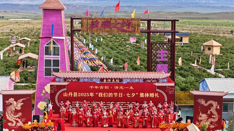山丹县积极引领婚姻新风尚,大力倡导“重感情、轻彩礼”的文明理念,一股回归爱情本真、追求简约温馨的婚俗新风,正为无数新人带来幸福新风。8月28日,山丹县老军乡玫瑰之约主题庄园,16对新人携手2对金婚、2对银婚夫妇共同参加了一场充满传统韵味的集体婚礼,展现出婚事新办简办的温馨场景。