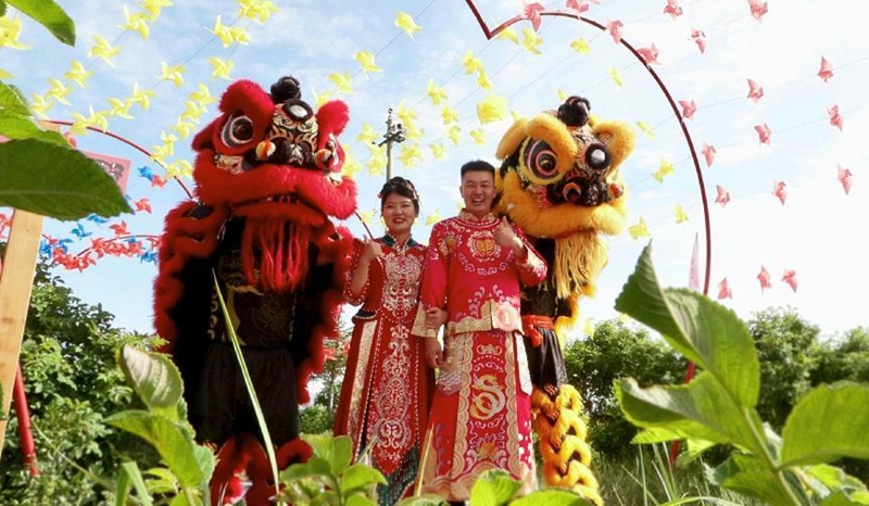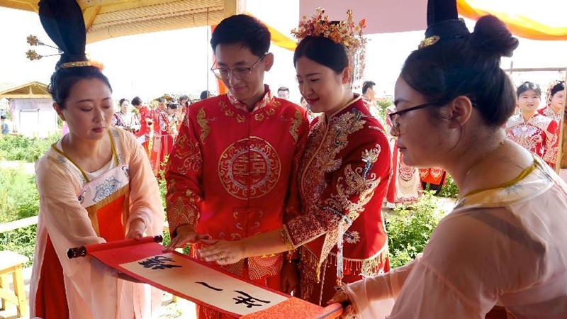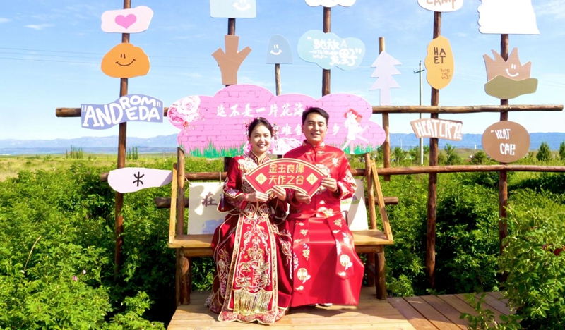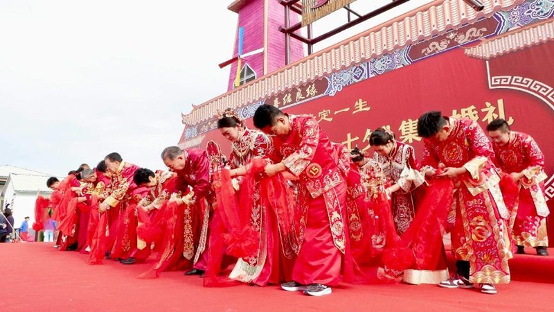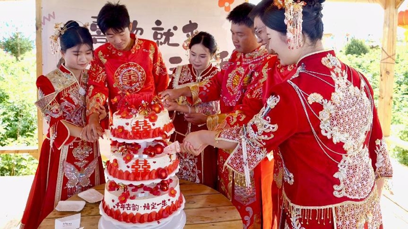 蓝天白云映照下的玫瑰庄园,16对新人手持团扇、身着中式礼服,在亲友和市民的见证下共同许下相爱一生的承诺。新人石银霞、樊鹏翔表示:“不大操大办、不铺张浪费的婚礼很有意义,契合新时代青年婚恋观。”这场没有豪华车队和昂贵彩礼的婚礼,处处洋溢着温馨的祝福与欢声笑语。