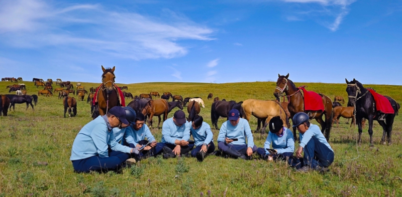 在山丹马场一场草原上,碧草如茵,祁连雪山巍峨连绵。牧马人们围坐在一起,专注地盯着手机屏幕上正在直播的阅兵盛况,脸上洋溢着自豪与喜悦的神情。不远处,成群的骏马悠闲地低头吃草,马鬃在微风中轻轻飘动,与牧马人观看阅兵的热烈场面相映成趣,展现出一幅生态保护与人文精神交相辉映的美好图景。这片曾经为国防事业供应军马的草原,如今正以它特有的方式,见证着国家的强盛与民族的复兴。