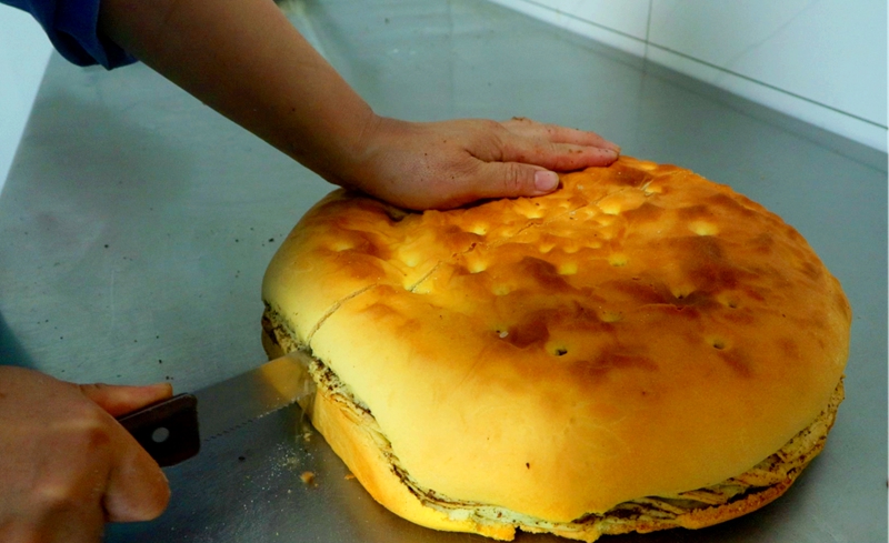 “我们山丹人中秋会吃这种大月饼,馅料是我们月饼的灵魂,用的是本地的香豆、胡麻这些,一层层铺上去,再卷起来擀开,最后手工做上花。这样做出来的千层月饼,整整有十二层,意思就是一年的十二个月,圆圆满满。”陇圆食品加工厂厂长马晓丽说。