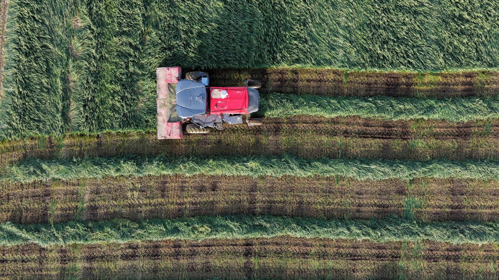 山丹马场坐拥广袤优质草场与耕地,近年来持续推进农业机械化升级,从种植到收割全环节广泛应用大型农机设备。收割现场,红色割草机如“钢铁画笔”,在葱郁的燕麦草海中辟出一道道规整的草垄;从空中俯瞰,绿色草甸与黄褐色收割带交错延展,农机穿梭其间,宛如在大地织就的天然锦缎上灵动跃动。