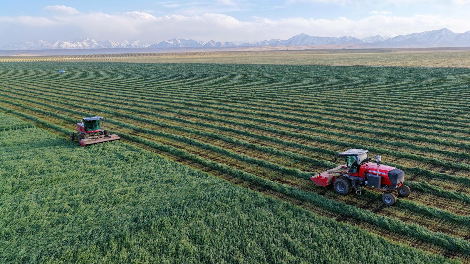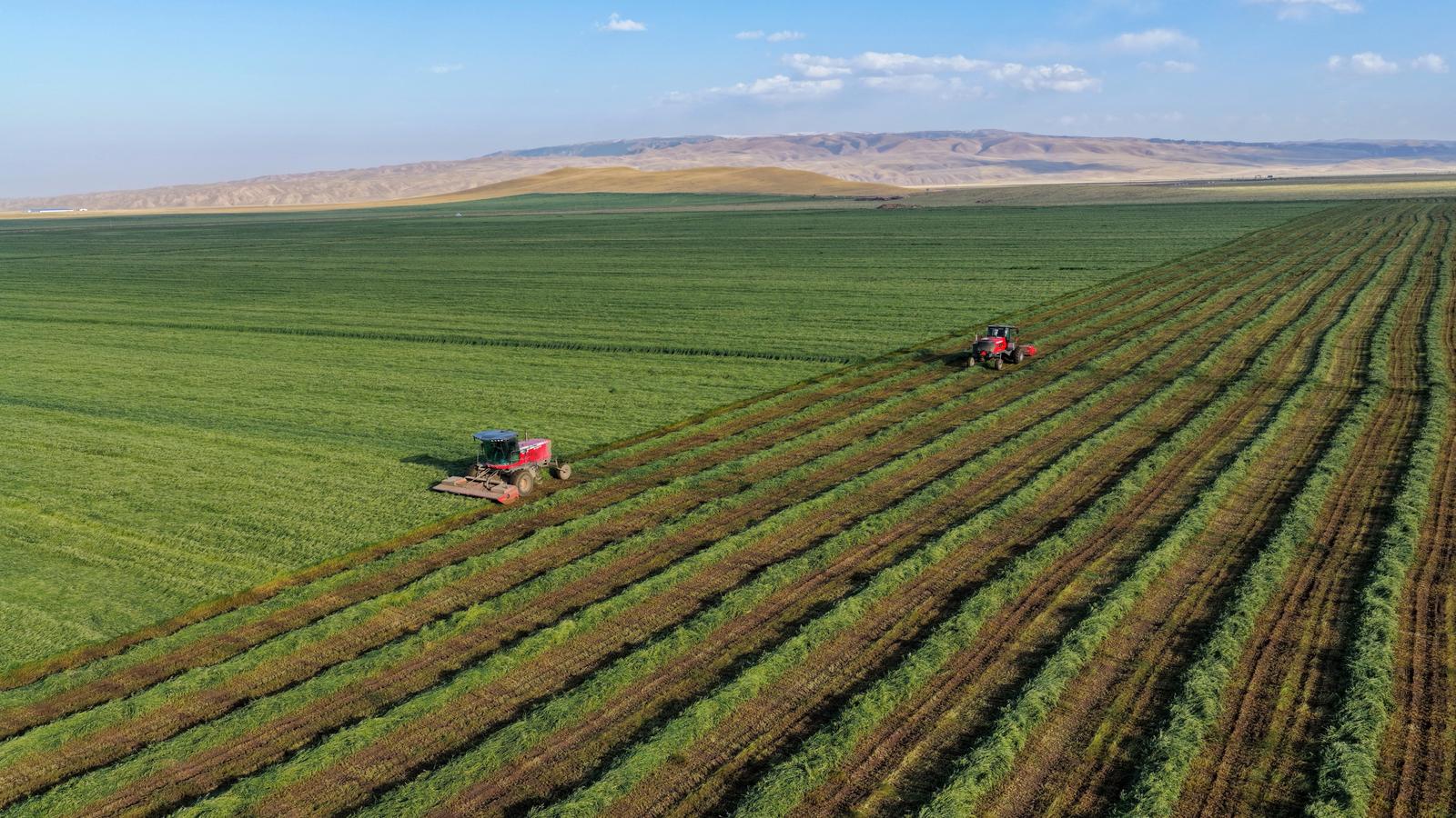 在广袤的田野上,大型割草机械轰鸣作响、往来穿梭,将连片长势喜人的燕麦草整齐割倒,拉开了今年燕麦草丰收的序幕,也在大地上勾勒出“机械为笔、草色为墨”的壮美丰收图景。