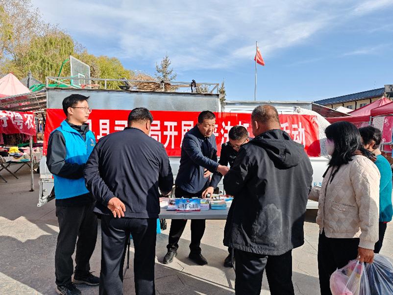 活动现场,法治元素与集市烟火气交融。工作人员在人流密集区域设立法律咨询台,悬挂宣传横幅,摆放民法典、法治宣传教育法、甘肃省法律援助条例等宣传资料,向过往群众、沿街商贩和商铺经营者发放图文并茂的宣传资料。