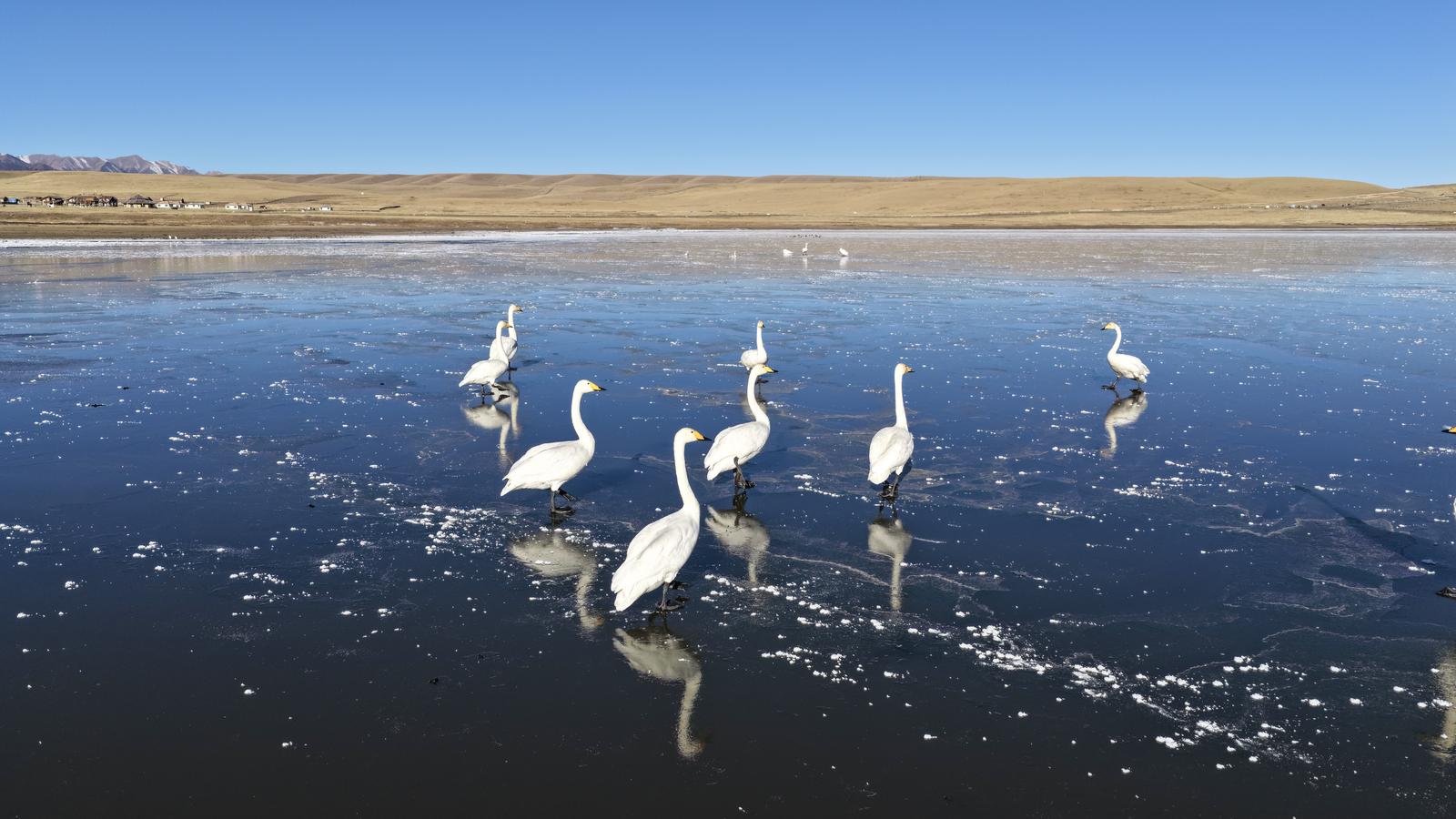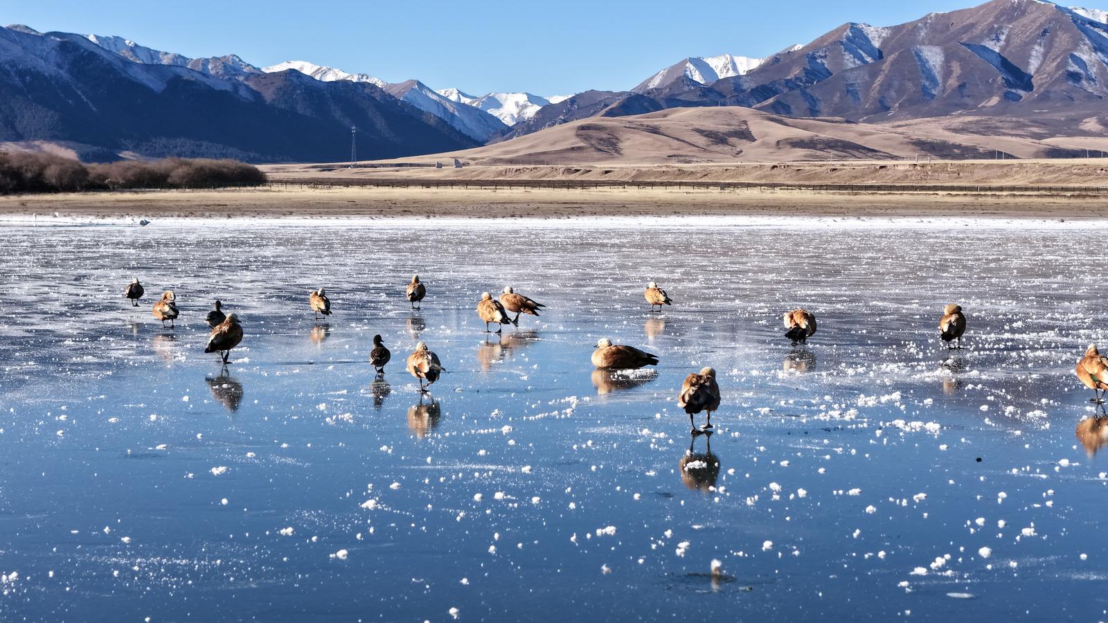 2025年11月18日,初冬的甘肃山丹马场鸾鸟湖湿地,一幅灵动的“湿地鸟类图谱”正徐徐展开——棕红色的赤麻鸭群在晶莹冰面上或低头理羽、或集群踱步,洁白的大天鹅在湛蓝湖水中舒展羽翼、优雅游弋,雪色的大白鹭则静立浅滩,细长喙部不时探入水中……三种珍稀鸟类在同一水域悠然共处,成为鸾鸟湖湿地生态持续向好的鲜活见证。(记者:王超 周莉娟)