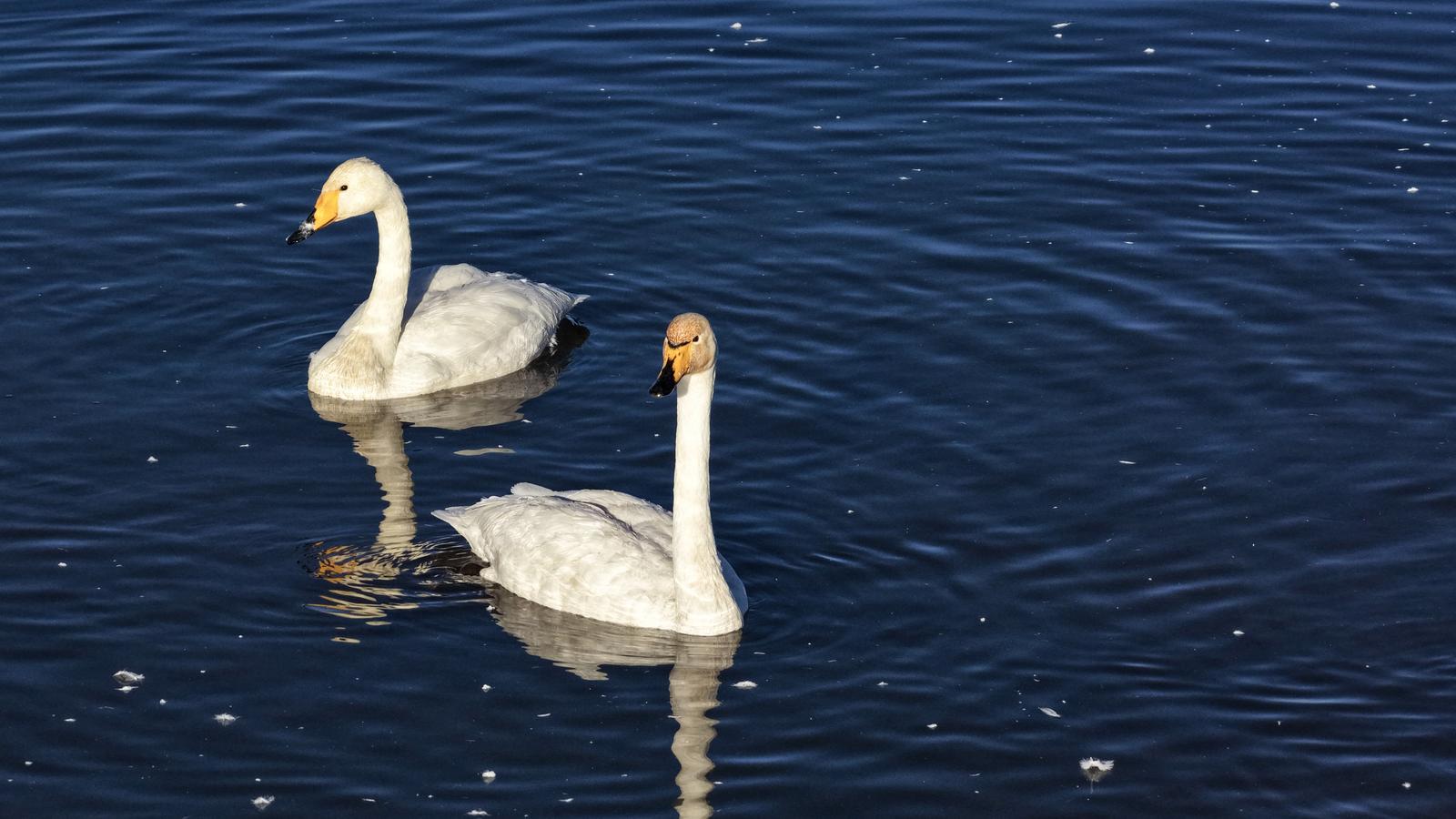 (洁白的大天鹅在湛蓝湖水中舒展羽翼、优雅游弋。)