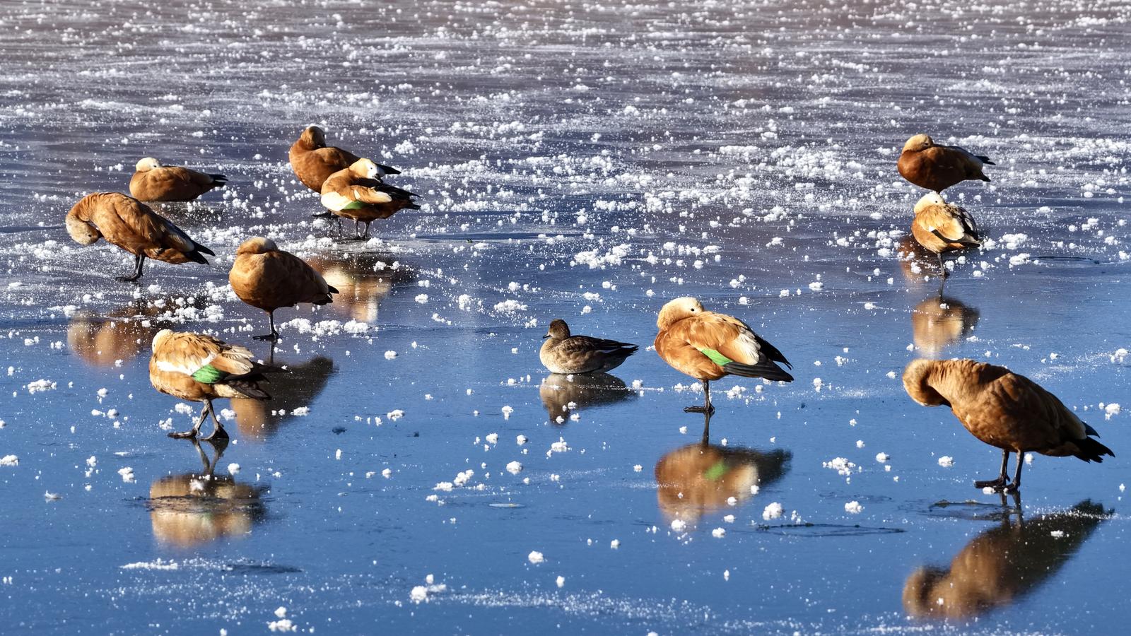 (棕红色的赤麻鸭群在晶莹冰面上或低头理羽、或集群踱步。)