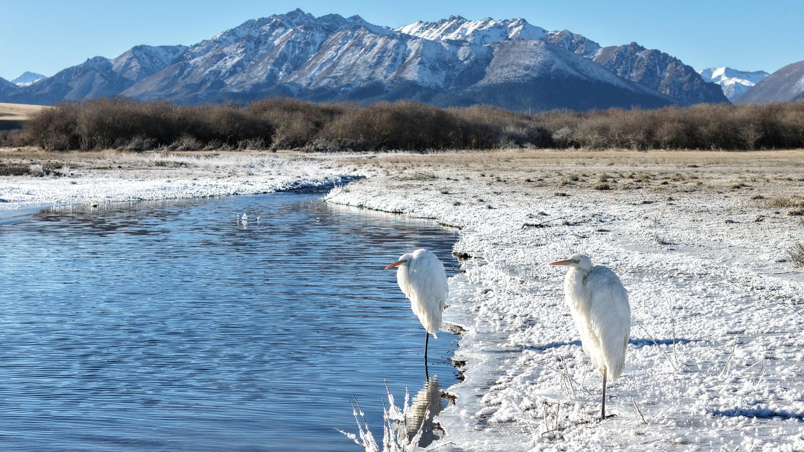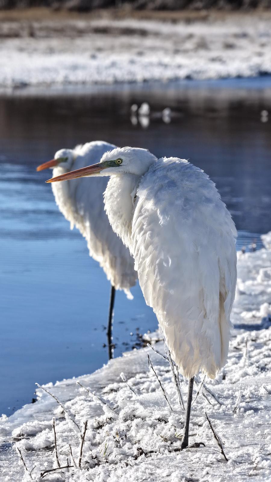 (雪色的大白鹭则静立浅滩,细长喙部不时探入水中。)