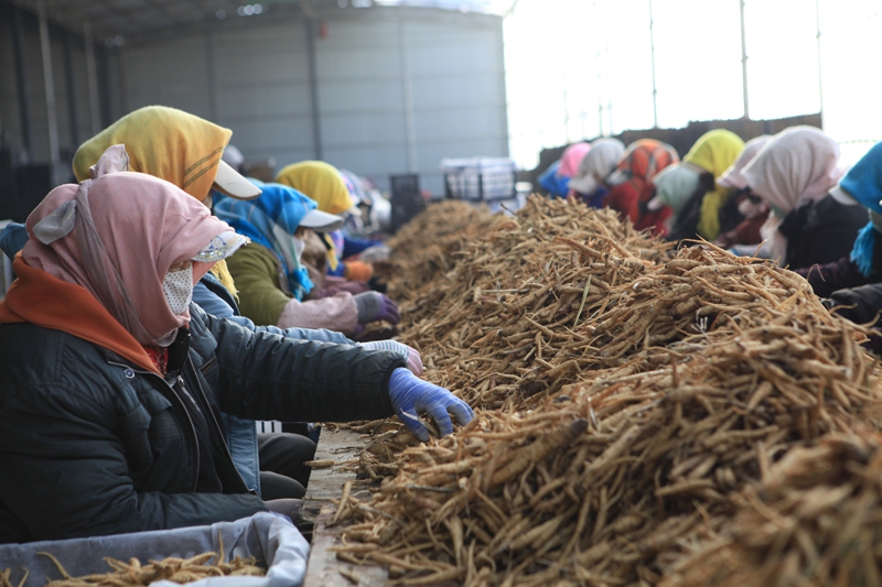 村民在李桥乡黄参产业园分拣黄参聂英摄