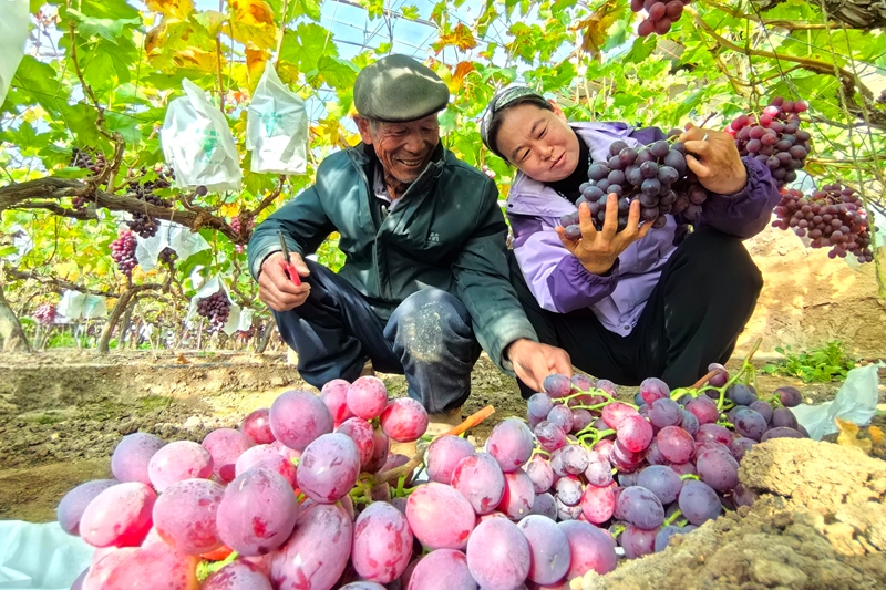 村民在葡萄大棚中采摘红提刘伯武摄