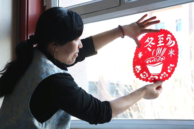 冬至前夕,山丹县非遗研发中心的玻璃窗上,一抹抹嫣红次第绽放。省级非遗传承人周玉梅手持银剪,在红纸上轻轻游走,纸屑如雪簌簌飘落,转瞬之间,“冬至”二字的方正古朴与“牛娃子饭”的生动纹样便跃然纸上,将河西走廊独有的冬至烟火气定格成永恒的文化符号。