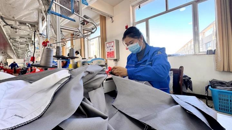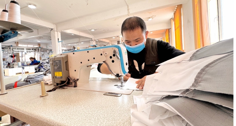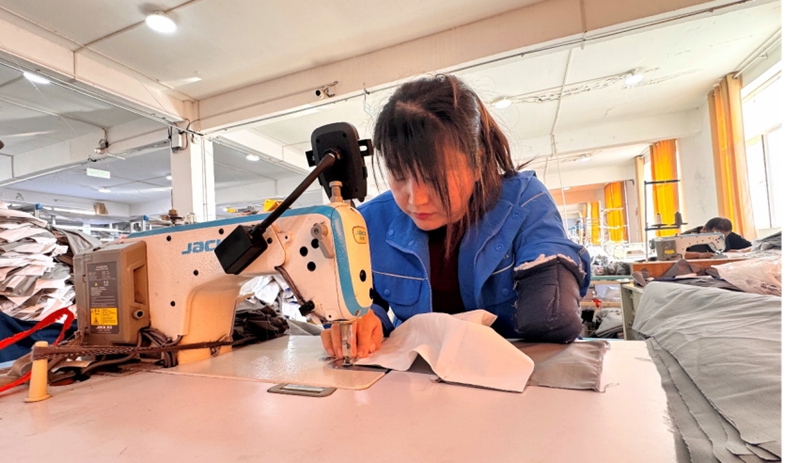 在海兰达服饰,像薛霞这样的员工并非个例。车间一角,有一位腿部残疾的女工安静地在流水线上忙碌。她叫王崇珍,因先天小儿麻痹导致腿部残疾。“像我这种情况在外面不能干其他的活。”王崇珍说,“到这里能给我提供合适的岗位,还有老师傅手把手地教,一个月三千多工资,对家庭有很大的帮助。”
