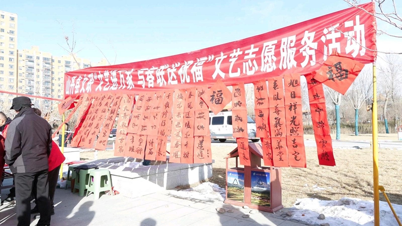 走近书画展示区,书法爱好者们凝神挥毫,笔走龙蛇。一副副洋溢着新春气息的对联跃然纸上。乡亲们围靠在桌子前,认真挑选心仪的新春对联,红纸黑字间,满载着对阖家安康、岁月祥和的美好期盼。