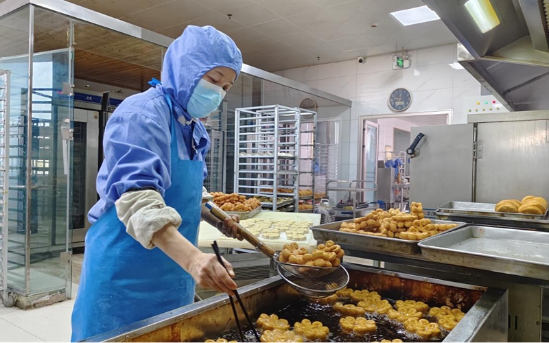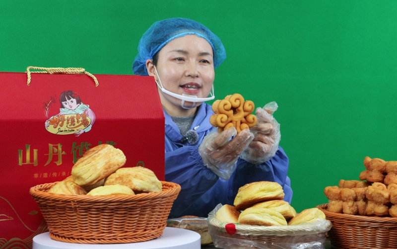 与农产品同样在“云端”走俏的,是承载着山丹人共同味觉记忆的传统面食——山丹馍馍。在山丹金穗陇圆食品有限公司的加工车间,醇厚的麦香弥漫整条生产线,一搓一捻间,千层饼层层叠叠,糖花子栩栩如生。公司紧抓春节消费旺季,直播间每日开播,主播现场展示馍馍,唤起无数游子乡愁。