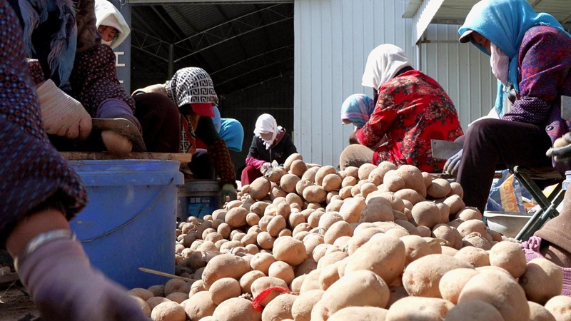 厂房另一侧,洋芋切种同样热火朝天。几位妇女围坐一圈,手起刀落,将种薯切成均匀块茎。“一天挣六十块钱,还能照顾家里。”村民钱兰花手脚麻利,言语间透着满足。旁边,切好的种薯码放整齐,等待15号下地播种。家门口的这份营生,让乡亲们增收顾家两不误。
