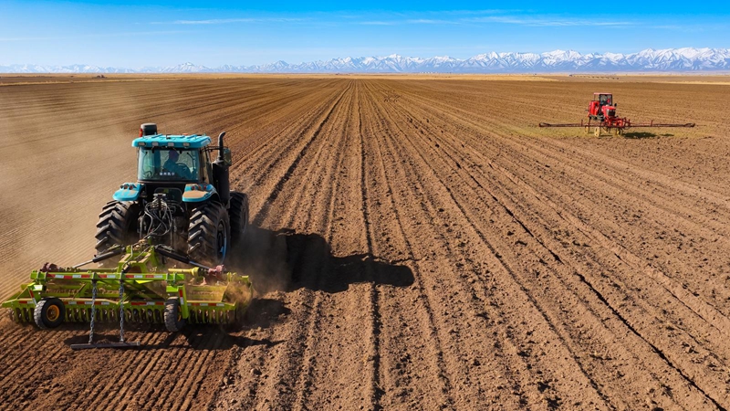 皑皑祁连雪峰矗立高原,融雪清泉滋养着万亩沃土。山丹马场二场春耕生产全面展开。雪山、良田、轰鸣的农机同框入画,勾勒出一幅雄浑壮美的高原春耕画卷。