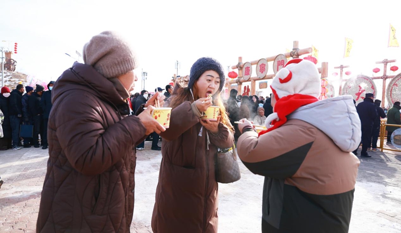 文艺展演间隙,一锅锅热气腾腾的“牛娃子饭”香飘四溢,熟悉的年节“烟火气”扑面而来。上万名游客有序走向餐区,领取一碗碗香气扑鼻的“牛娃子饭”。大家或端着饭碗趁热品尝,或围坐成圈边吃边聊,热气模糊了眉眼,却挡不住脸上的笑意,现场满是邻里相聚、共享美食的温馨景象。