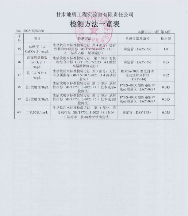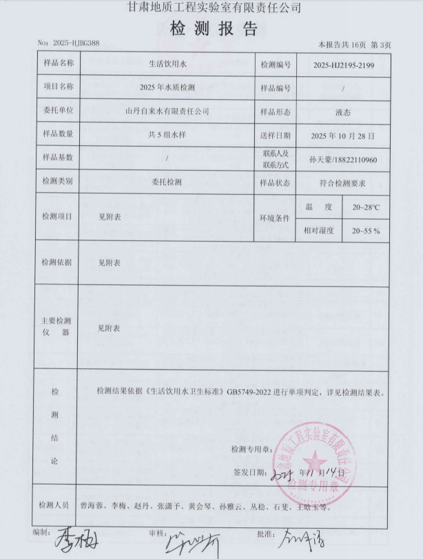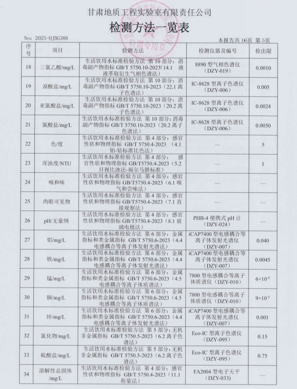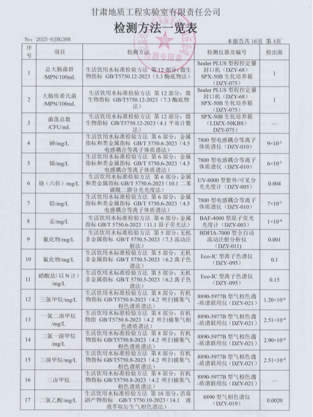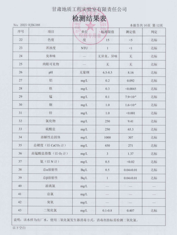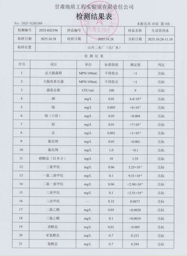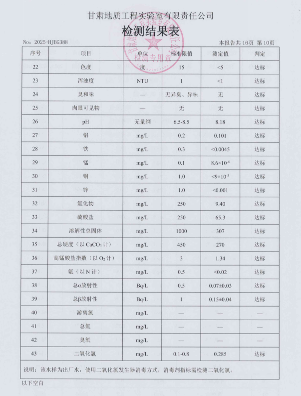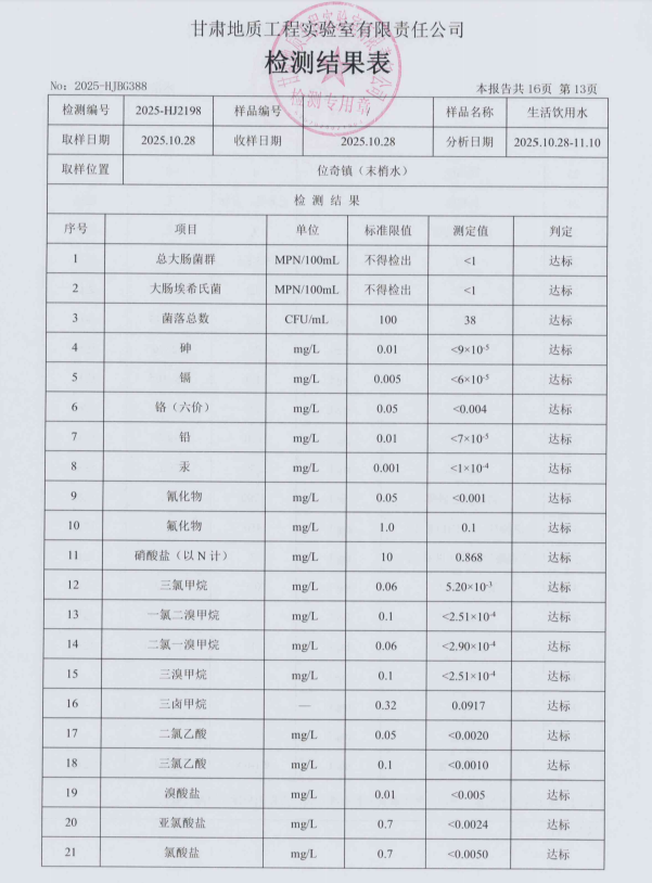 现将2025年第四季度生活饮用水水质检测信息公开如下: