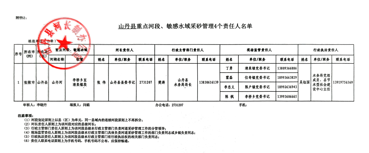 山丹县重点河段、敏感水域采砂管理4个责任人名单